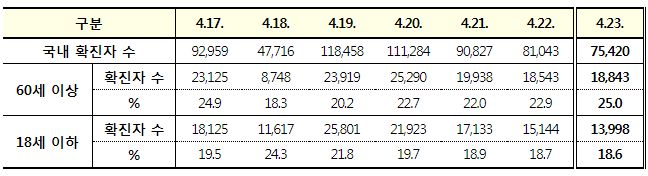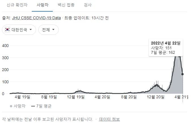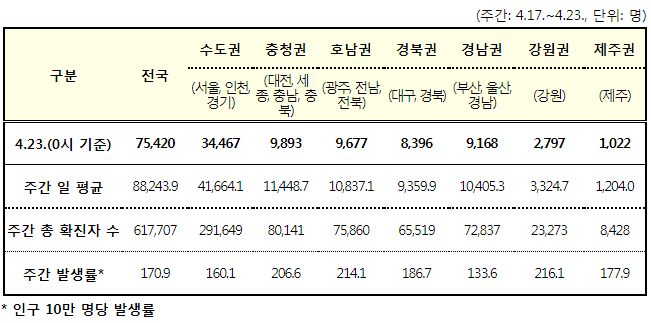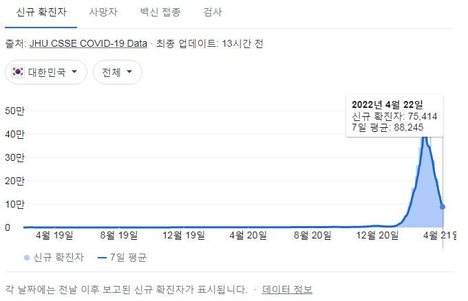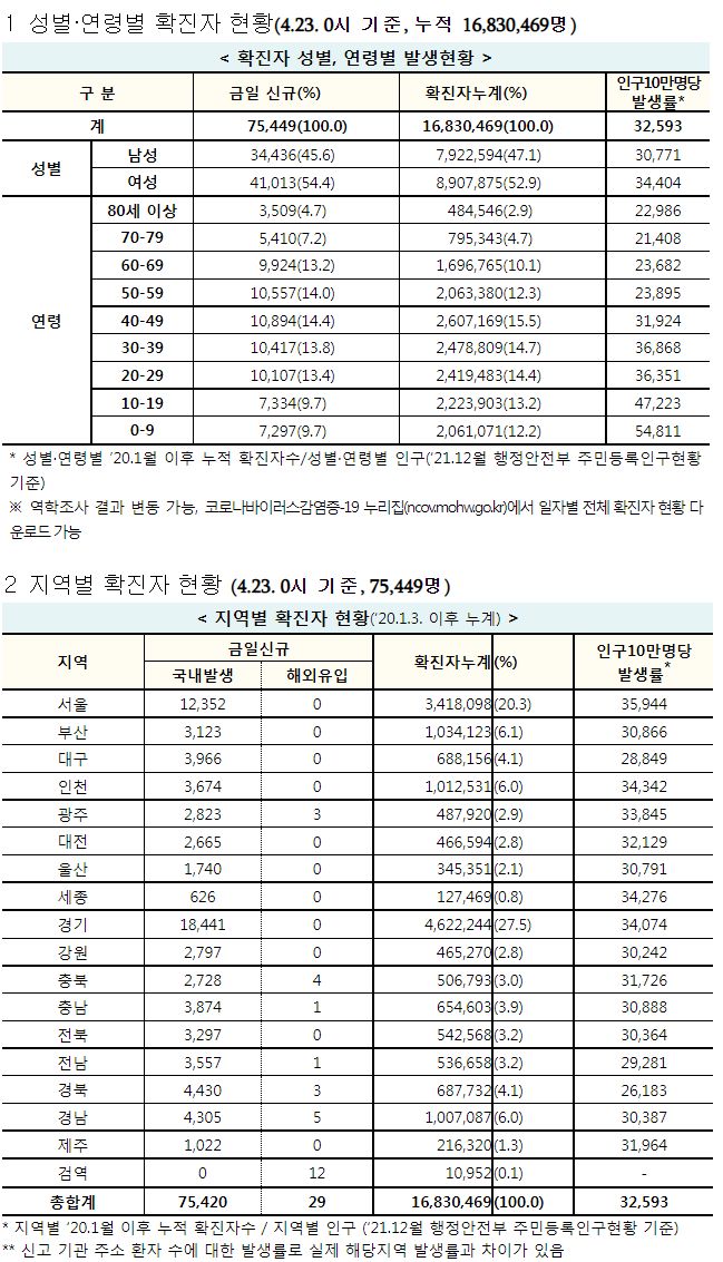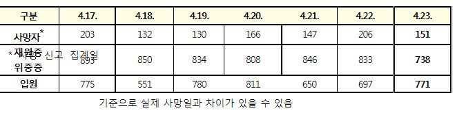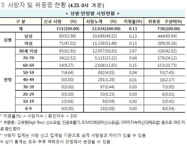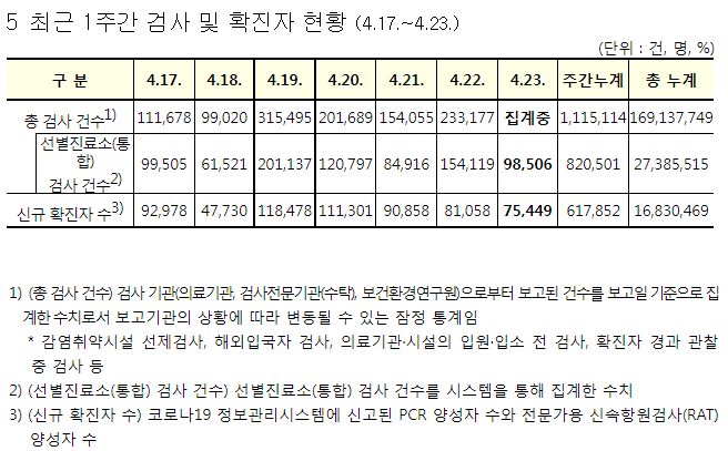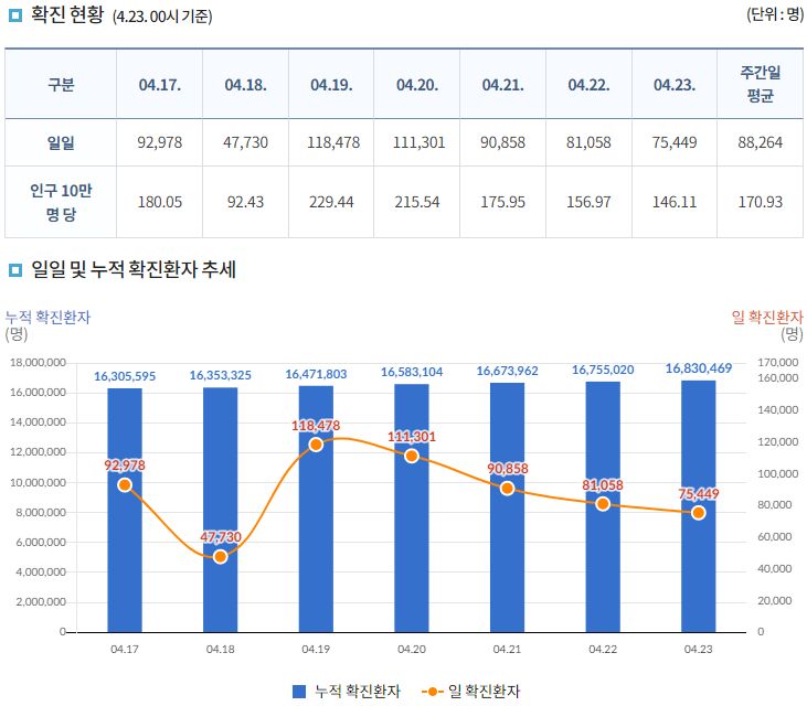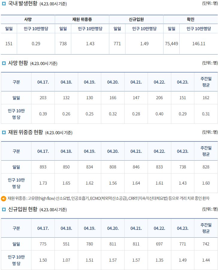 코로나19집계(2022.4.23): 확진 +7.5만, 사망 +151명, 중환자실가동률 36%, 재택치료 56만(집중관리 4.8만) 본문