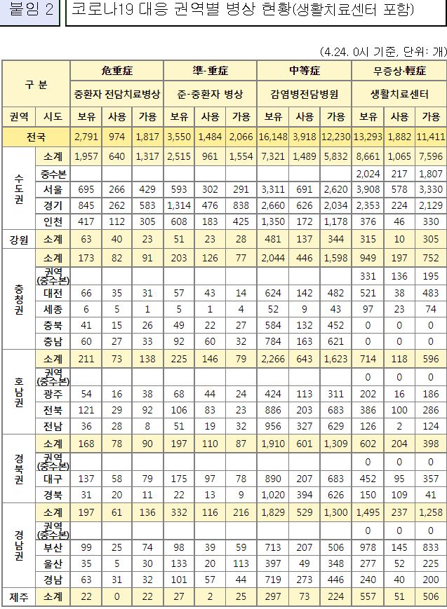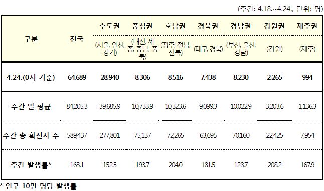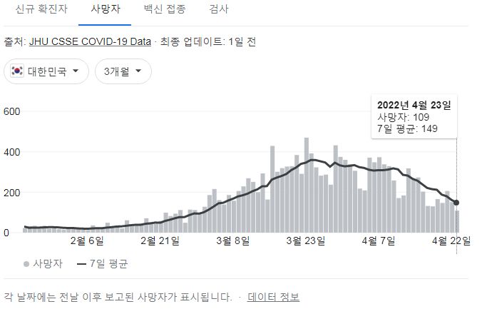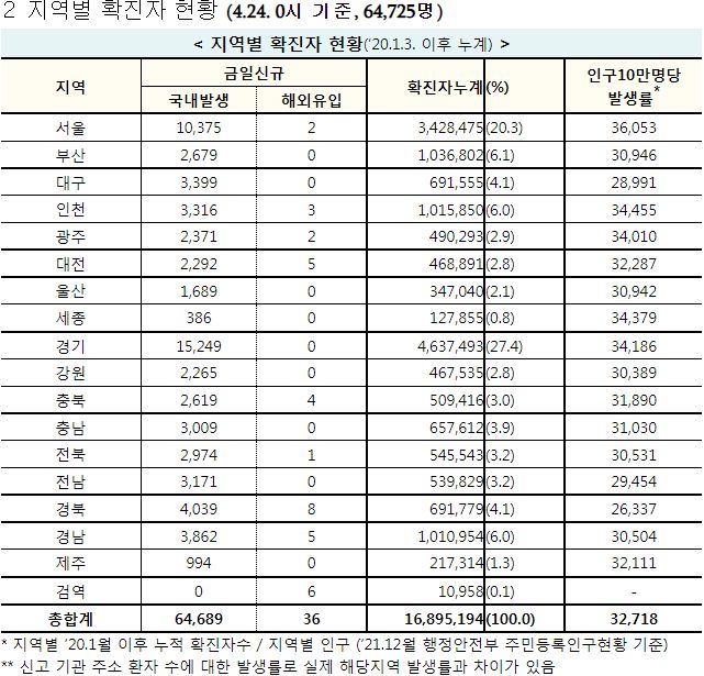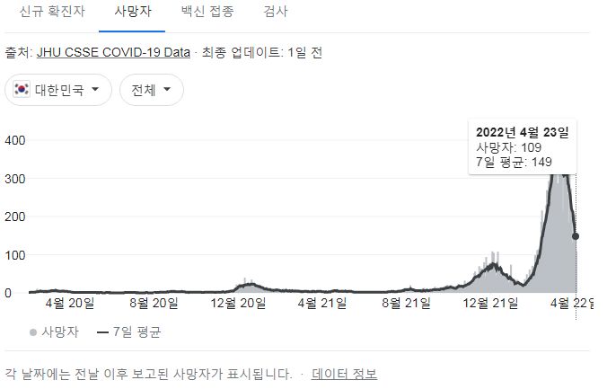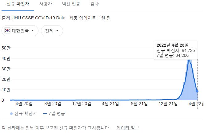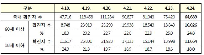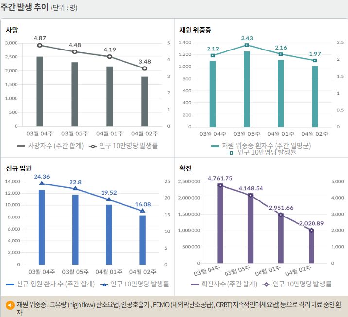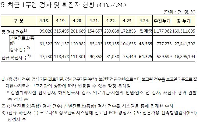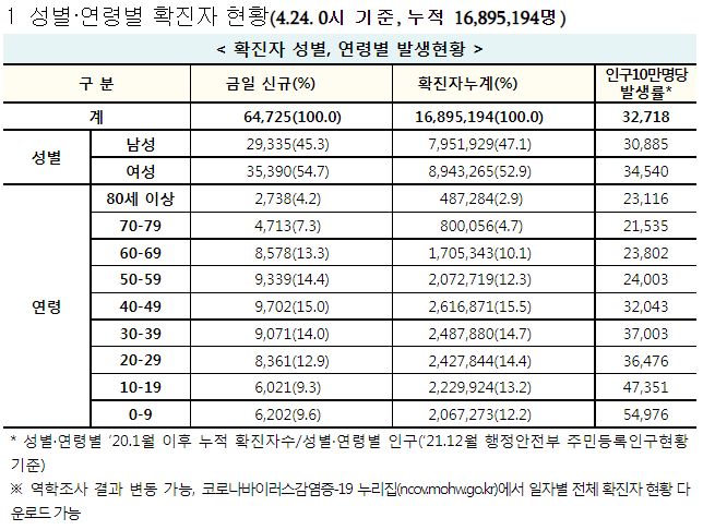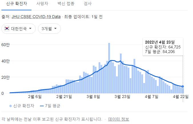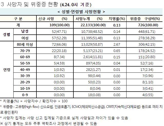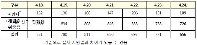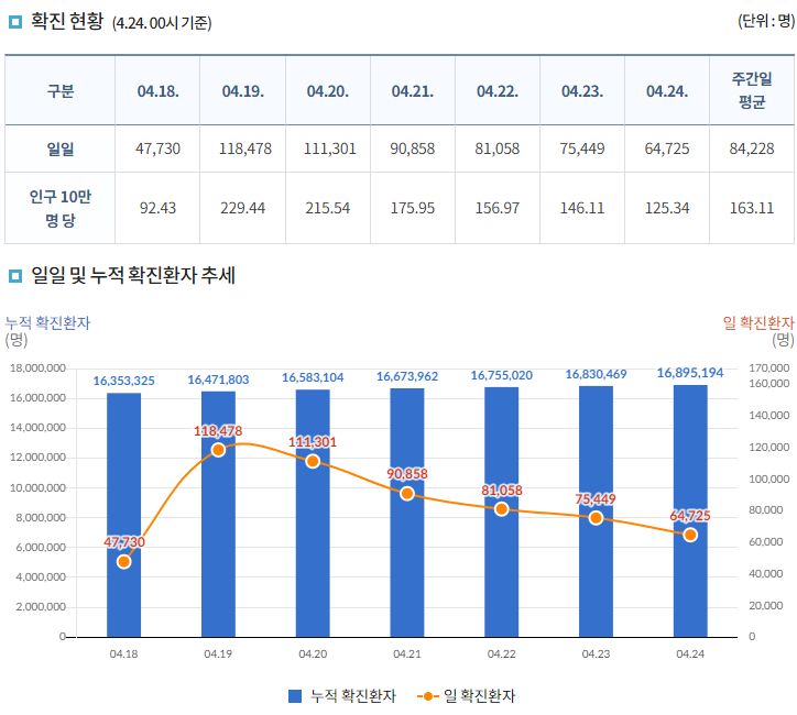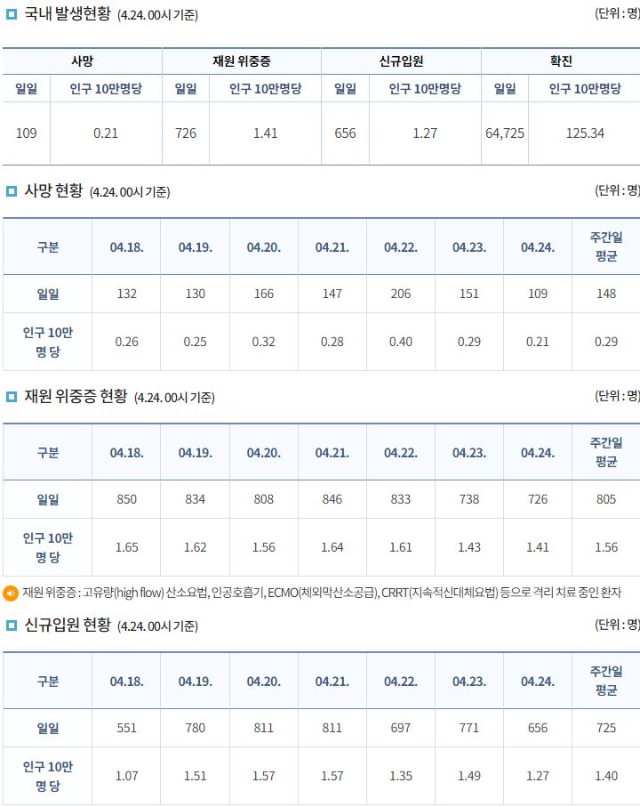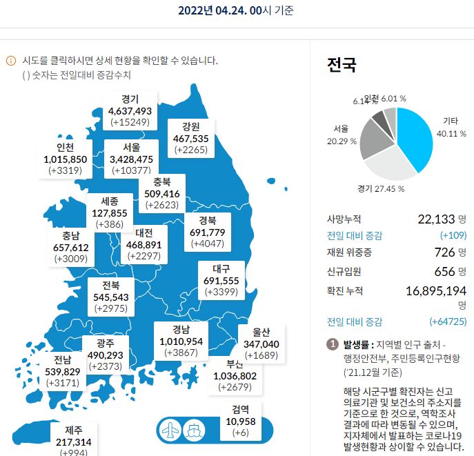 코로나19집계(2022.4.24): 확진 +6.5만, 사망 +109명, 중환자실가동률 35%, 재택치료 55만(집중관리 4.8만) 본문