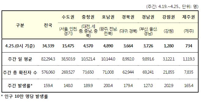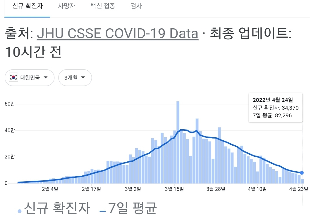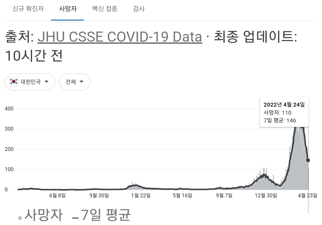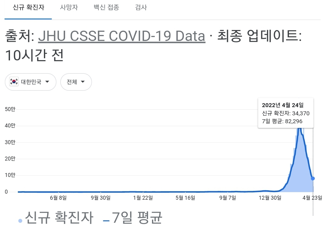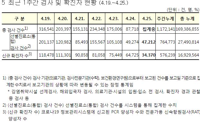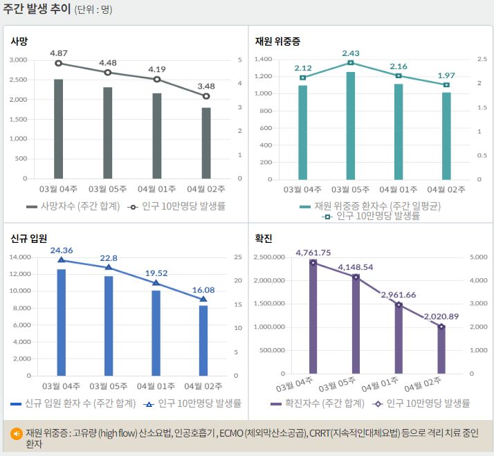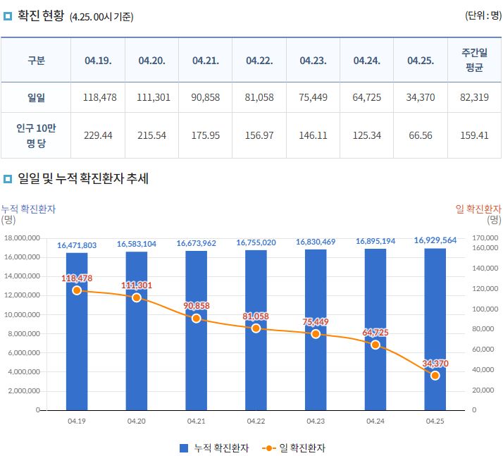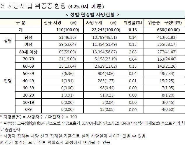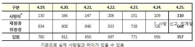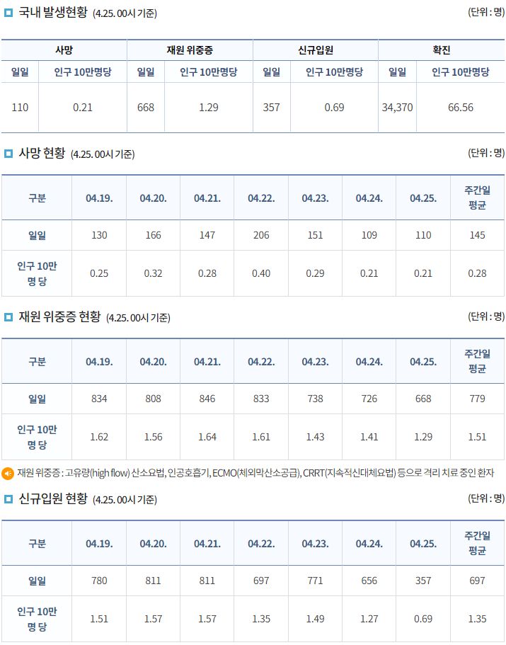 코로나19집계(2022.4.25. 0시기준): 확진 +3.4만, 사망 +110명, 중환자실가동률 36%, 재택치료 51만(집중관리 4.5만) 본문