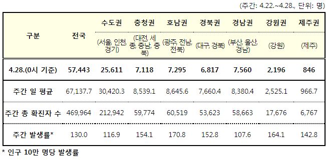 * 주간 수도권 발생률이, 경남권을 제외한 전국 타지역보다 낮은 것이 특징적입니다.