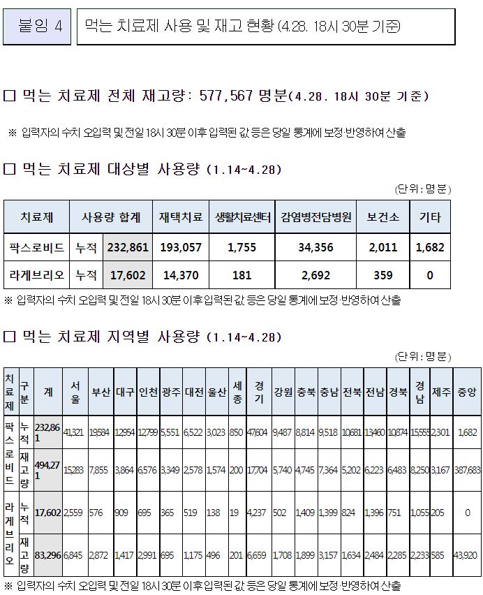 먹는 치료제(팍스로비드, 라게브리오) 재고와 사용 현황