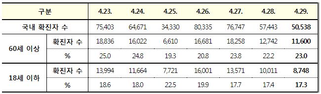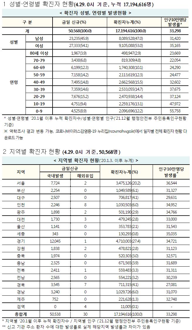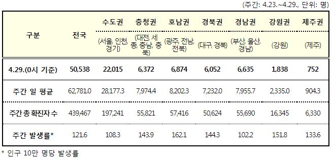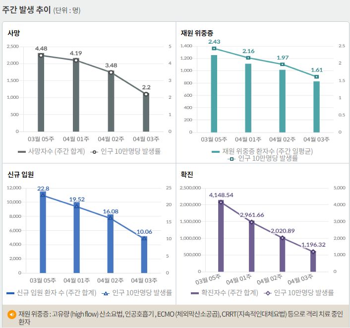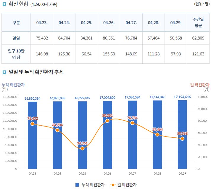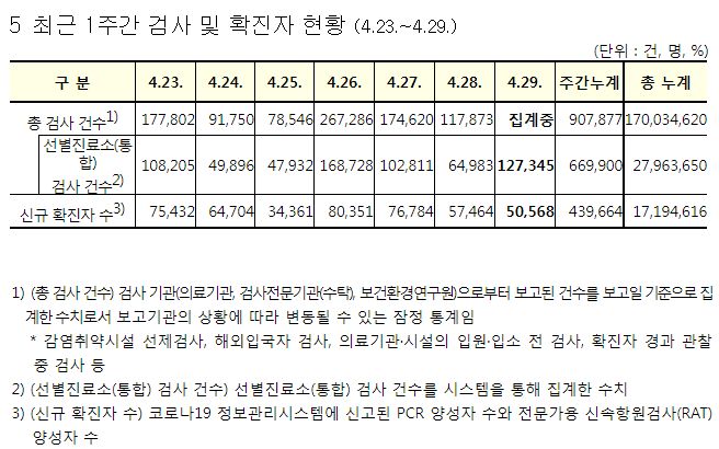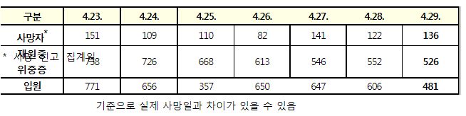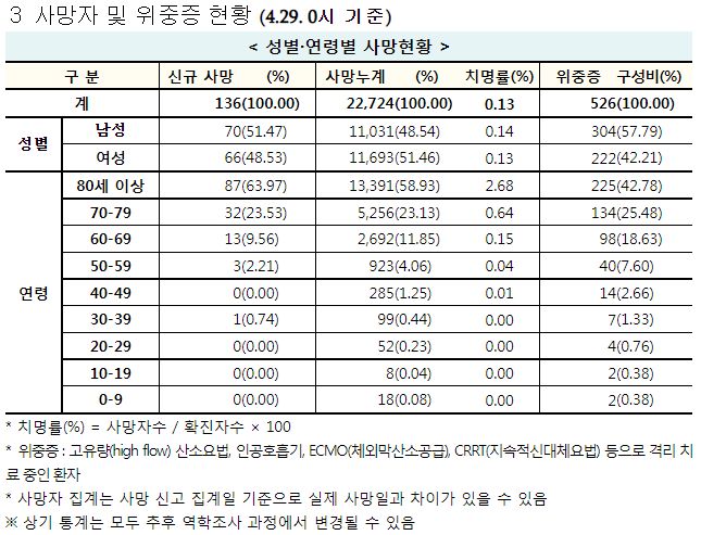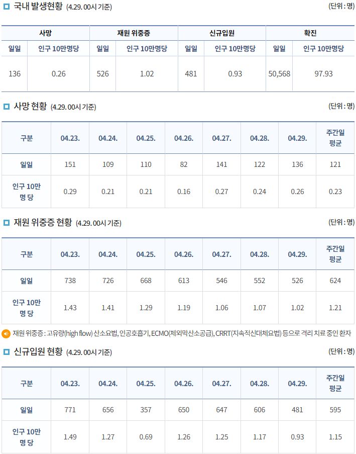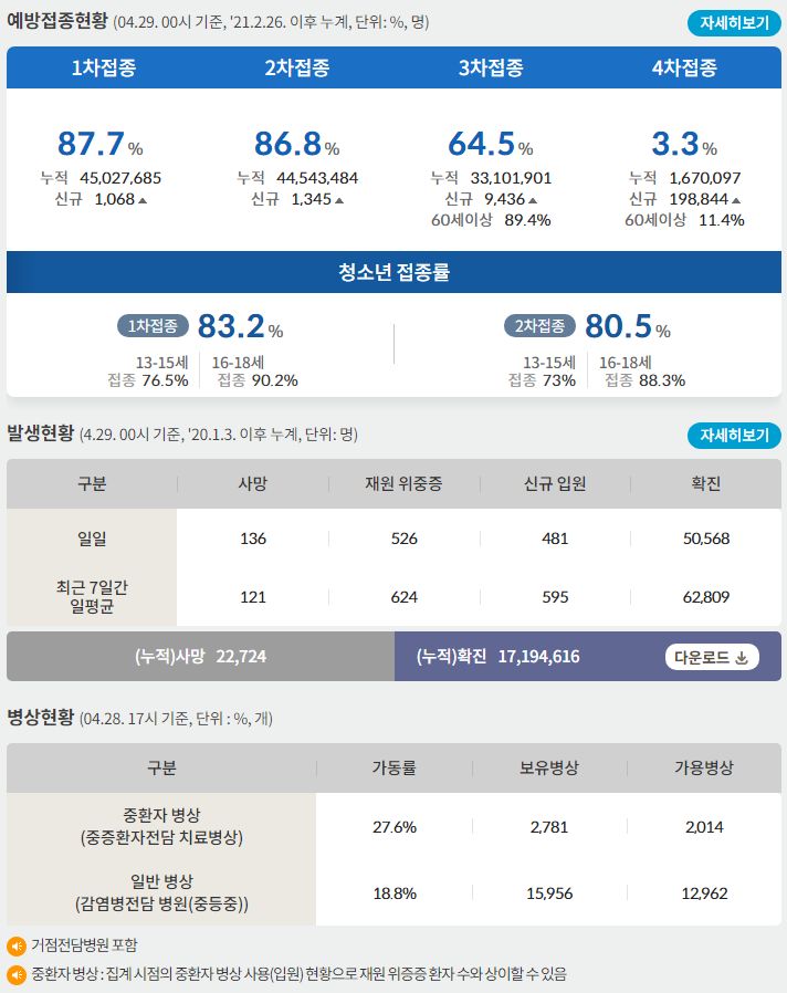 코로나19집계(2022.4.29. 0시기준): 확진자 +5.1만, 사망자 +136명, 중환자실가동률 28%, 재택치료 39만(집중관리 3.5만) 본문