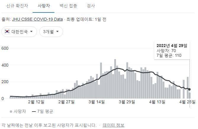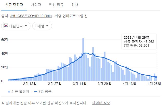 | 코로나19(2022.4.30 0시기준): 확진 +4.3만, 사망+70명, 중환자실 가동률 26%, 요즘 질병관리청, 재택치료 ??만(집중관리 ??만)/:/ 실외 마스크착용의무 일부만 남기고 해제 (0) | 2022.04.30 |