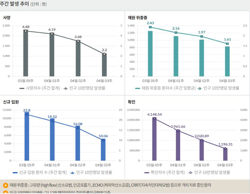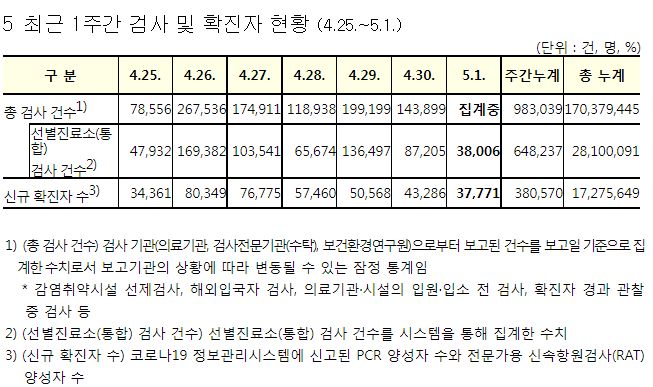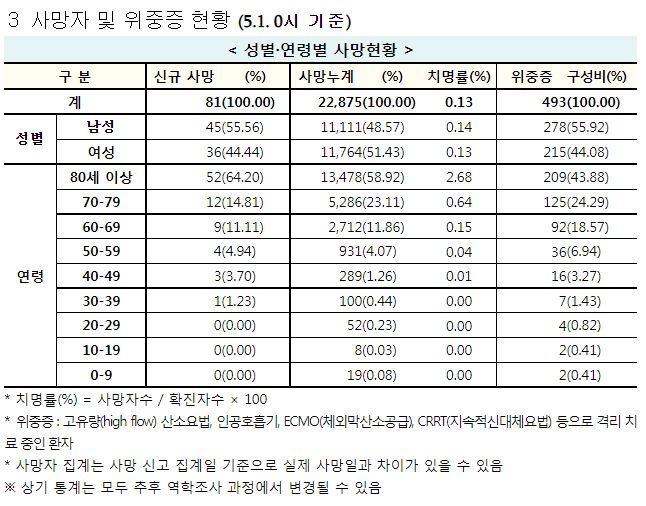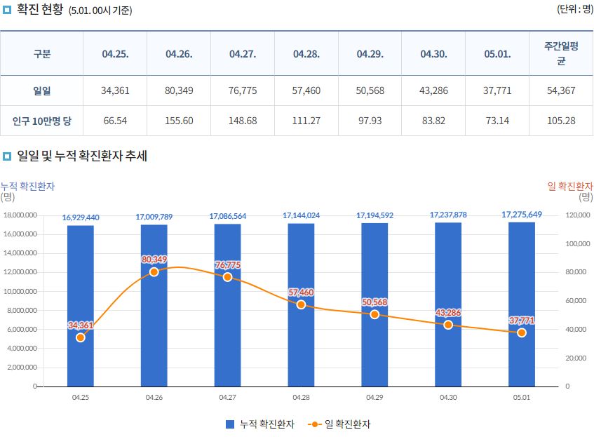 코로나19집계(2022.5.1. 0시기준): 확진 +3.8만, 사망 +81명, 중환자실가동률 25%, 재택치료 36만(집중관리 3.2만) 본문