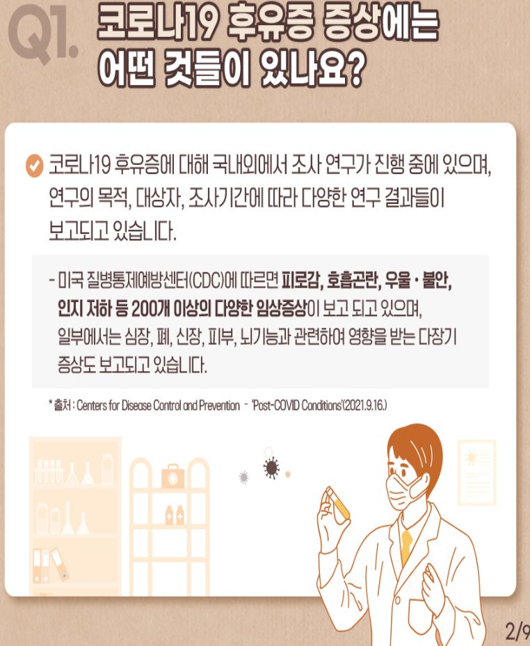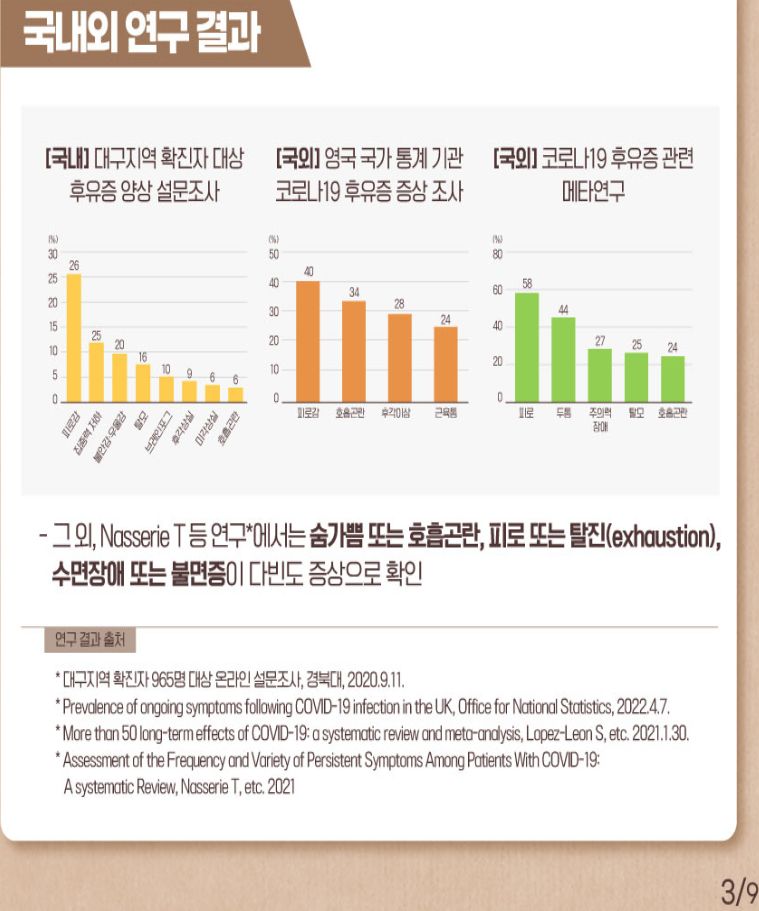 ㅡ "한국 국립보건연구원이 지난 3월 발표한 통계에서도 국내 코로나19 감염자 중 20~79%가 피로감, 호흡곤란, 건망증, 수면장애, 기분장애 등 증상을 주로 겪은 것으로 밝혀졌다."