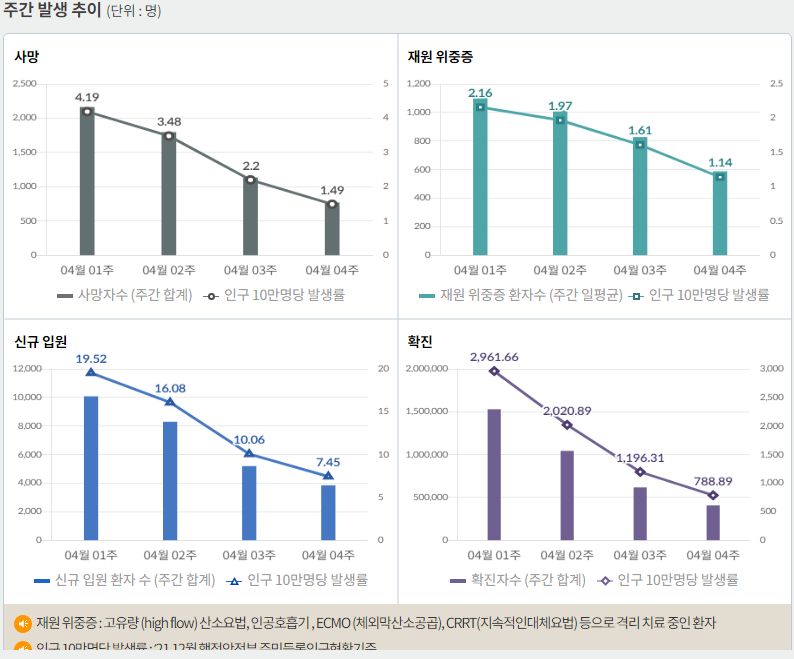 | 코로나19(2022.5.3) 4월 4주 코로나19 주간 발생 동향 및 위험도 평가 - 질병관리청 (0) | 2022.05.03 |