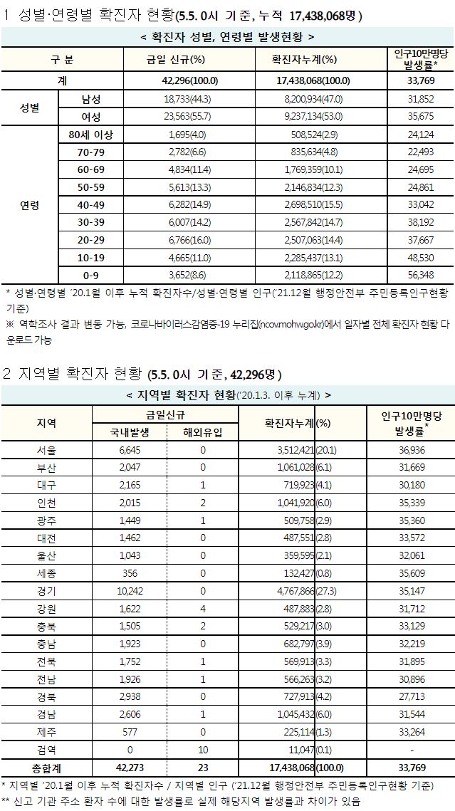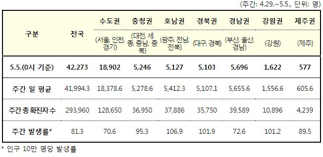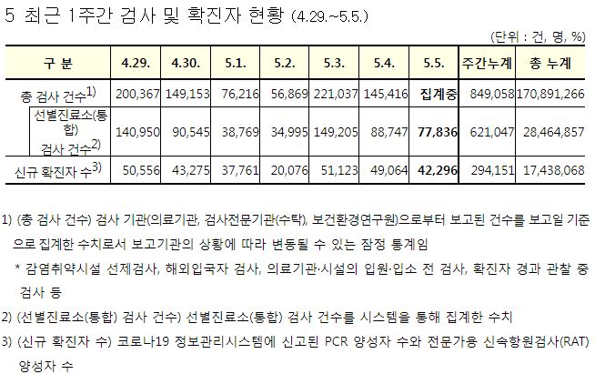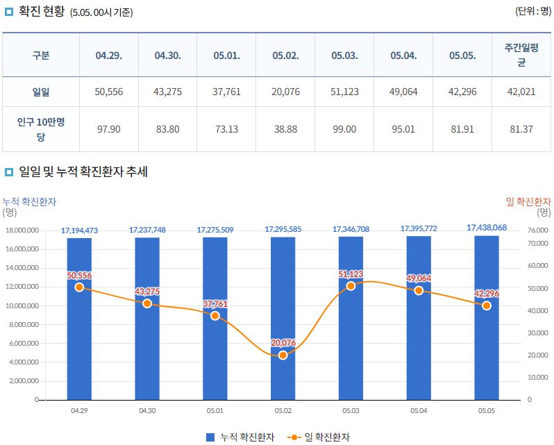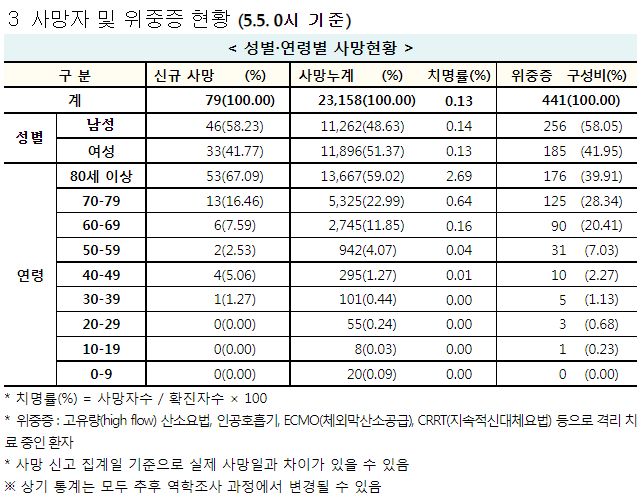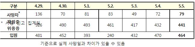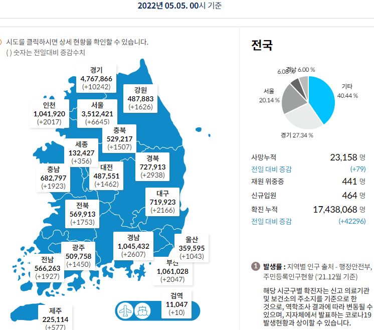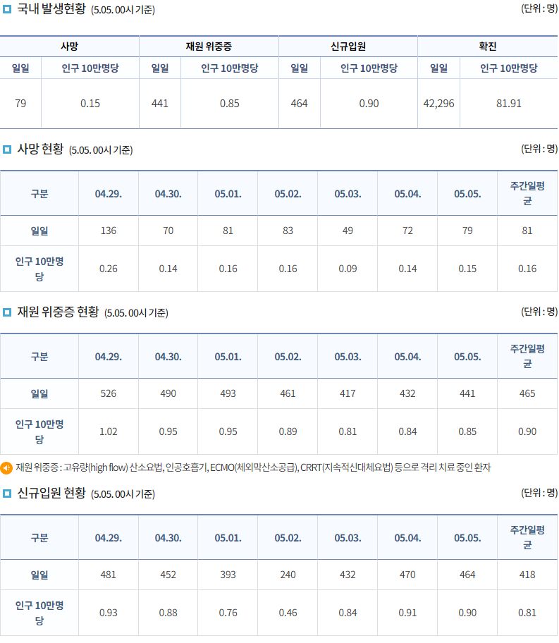 코로나19집계(2022.5.5. 0시기준): 확진 +4.2만, 사망 +79명, 중환자실가동률 22%, 재택치료 25만(집중관리 2.2만) 본문