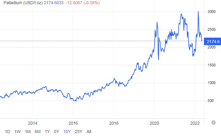 세계시장에서 팔라듐은 러시아생산이 43%였는데, 전쟁발발 직후에는 12%만 올랐다. 그러다 다시 안정? 지난 10년간 계속 올랐던 여파일까?
