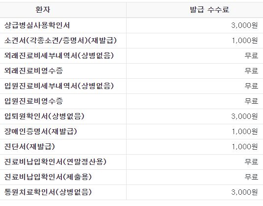 ㅡ 의무기록사본 발급 수수료 : 5매까지(1매당 1,000원 / 6매부터 1매당 100원)