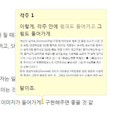 그런데, 주석태그, [ footnote ] (거시기머시기) [ /footnote ](공백문자는 일부러 넣었습니다)를 사용해 글에 각주를 만들 때, 주석태그 안에서 엔터를 칠 때와 쉬프트 엔터를 칠 때 보이는 것이 다릅니다. 요즘 티스토리가 주석코드에 신경을 조금 써주고 있어요. 주석 안에 하이퍼링크도 들어가고 이미지가 들어가게1.. 주석 풍선은 하이퍼링크 클릭은 안 되지만2 이렇게 그림을 넣어 표시해줍니다.