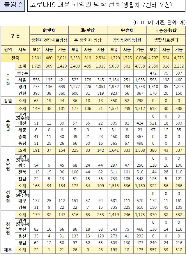 코로나19집계(2022.5.10. 0시기준): 확진 +5.0만, 사망 +62명, 위중증병상가동률 19%, 재택치료 23만(집중관리 1.7만) 본문