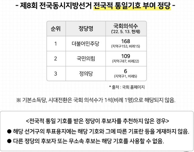 "이번 지방선거에서는 국회 의석수가 가장 많은 더불어민주당이 기호 1번, 국민의힘은 2번, 정의당은 3번을 받게 된다" - 연합뉴스, 2022.5.12