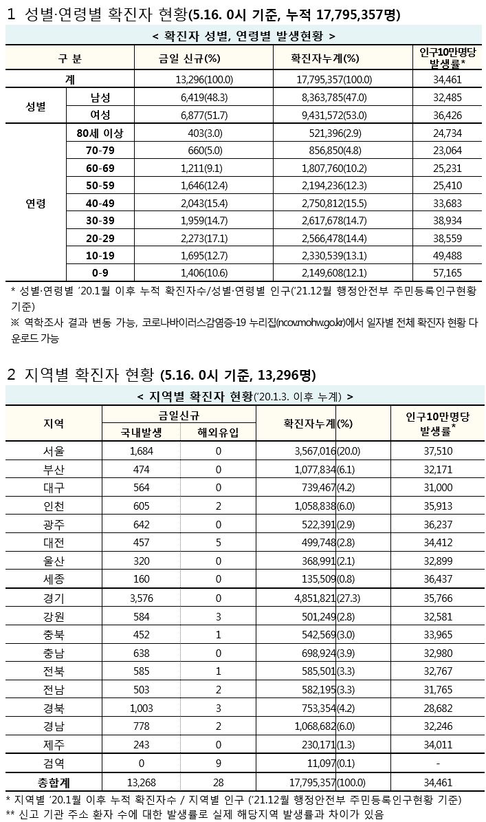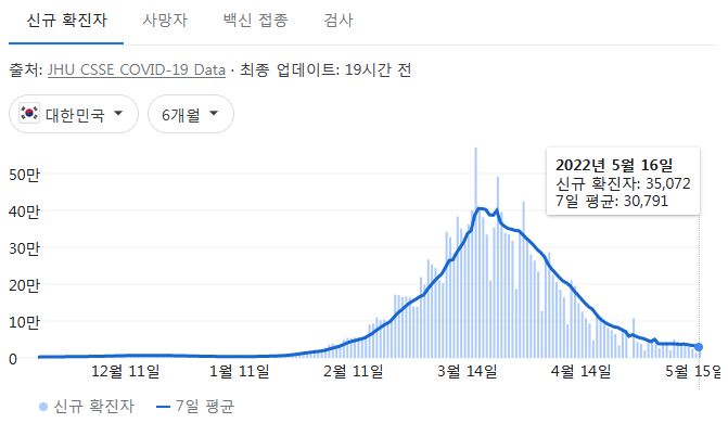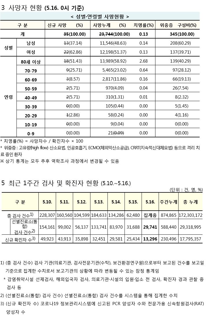코로나19집계(2022.5.16. 0시기준): 확진 +1.3만, 사망 +35명, 위중증병상가동률 18%, 재택치료 20만(집중관리 1.5만) 본문