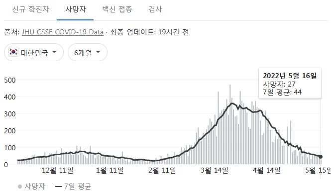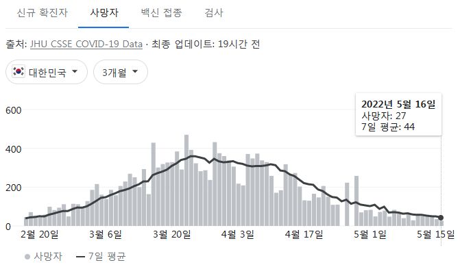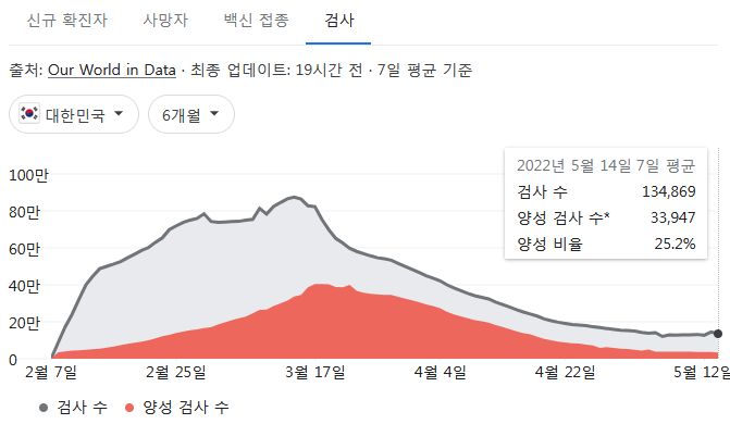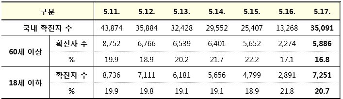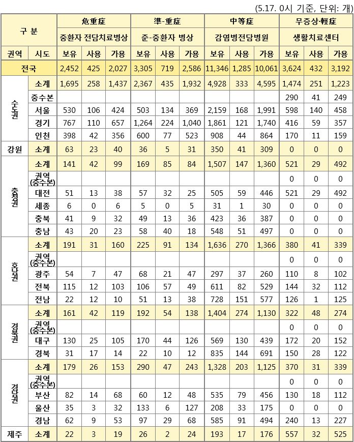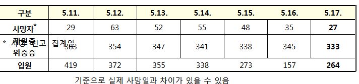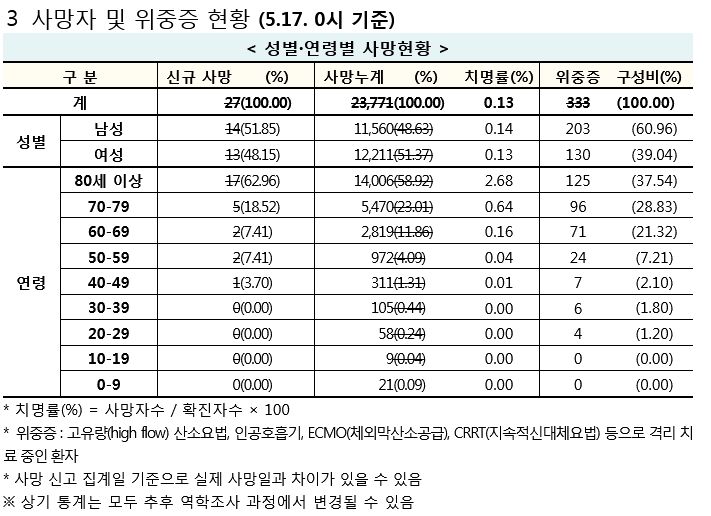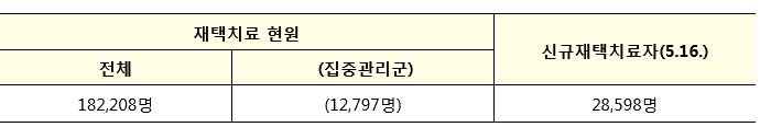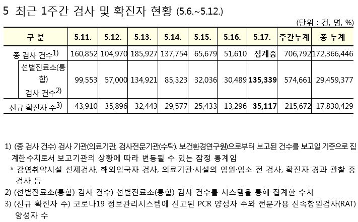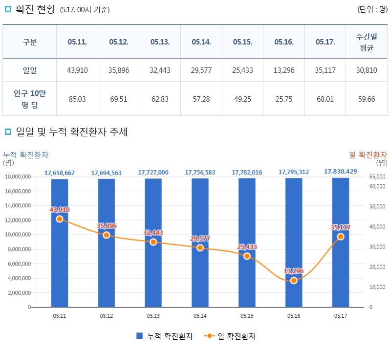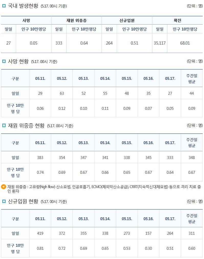 코로나19집계(2022.5.17. 0시기준): 확진 +3.5만, 사망 +27명, 위중증병상가동률 16%, 재택치료 18만(집중관리 1.3만) 본문