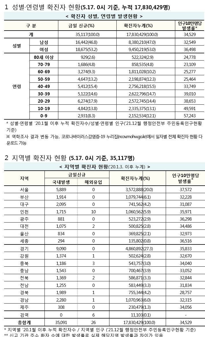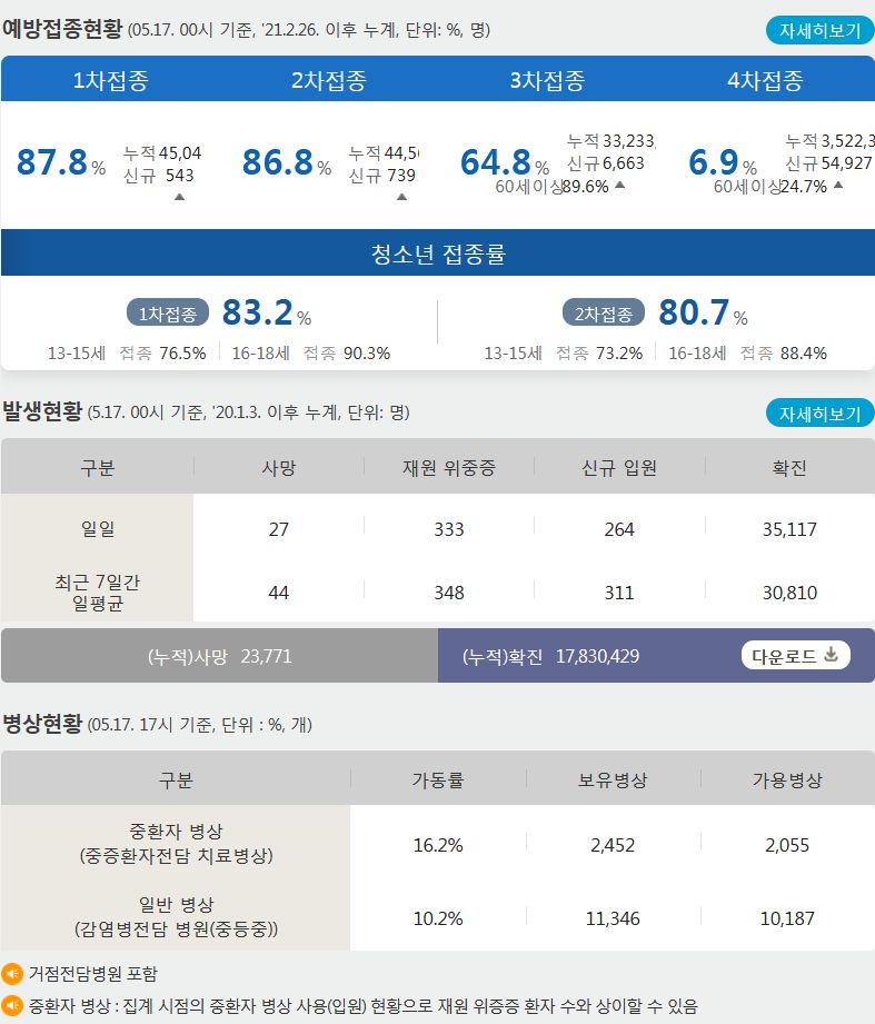 코로나19집계(2022.5.17. 0시기준): 확진 +3.5만, 사망 +27명, 위중증병상가동률 16%, 재택치료 18만(집중관리 1.3만) 본문