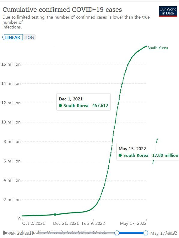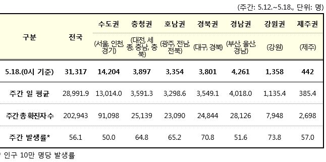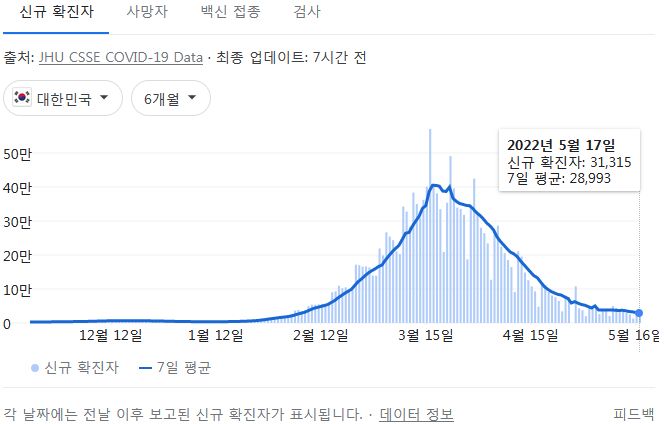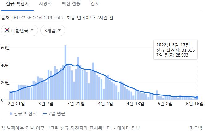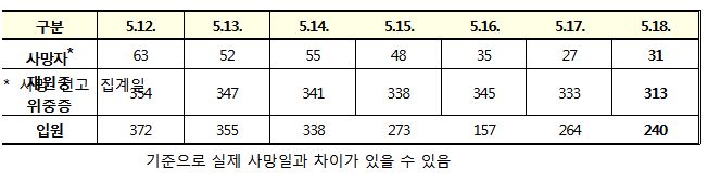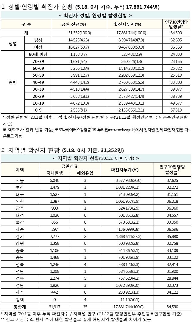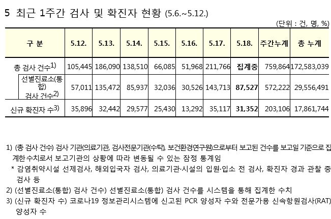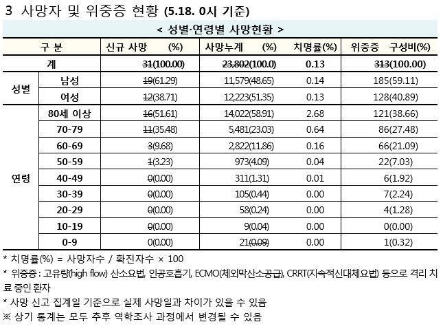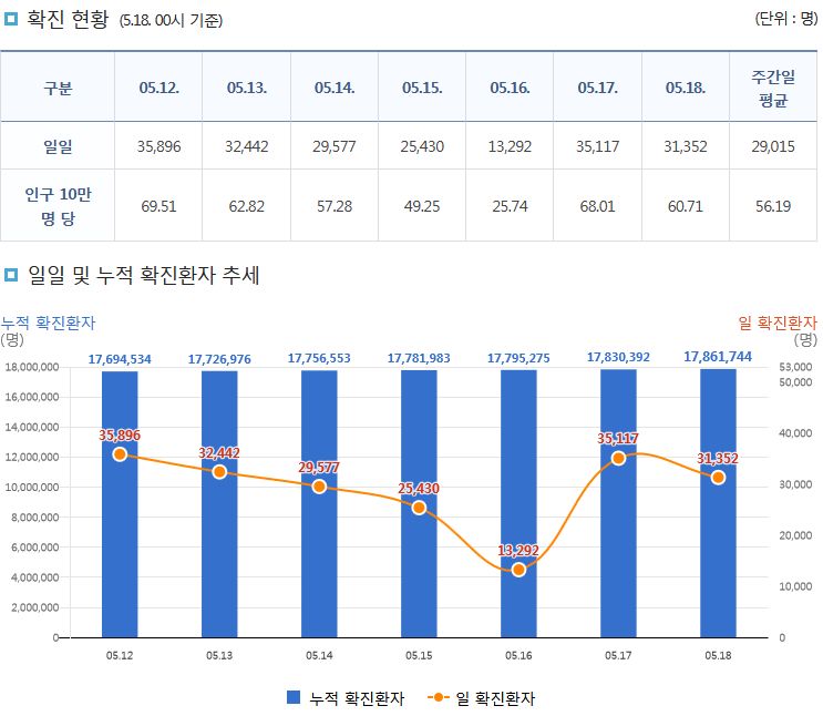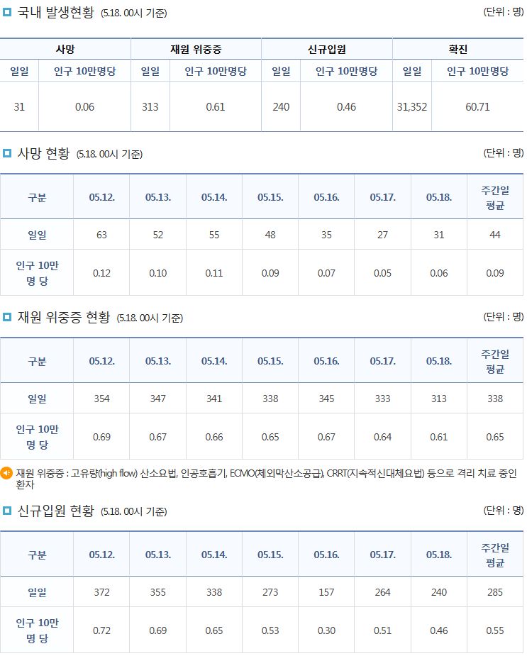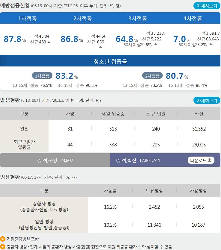 코로나19집계(2022.5.18. 0시기준): 확진 +3.1만★, 사망 +31명, 위중증병상가동률 16%, 재택치료 18만(집중관리 1.3만) 본문