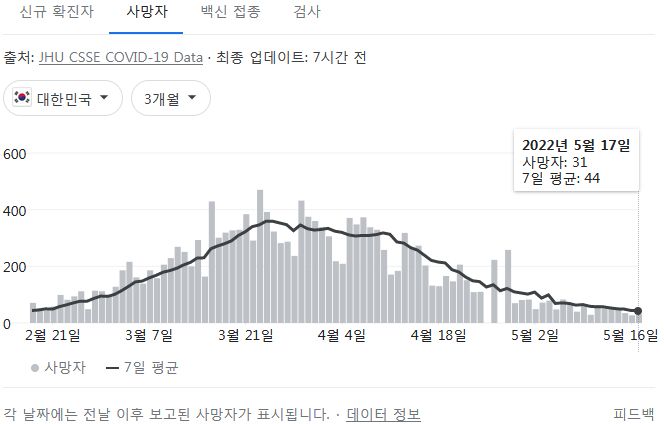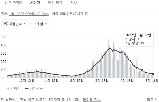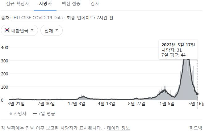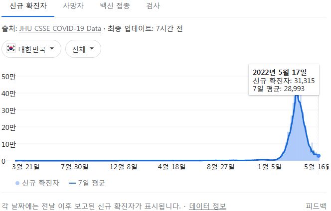 아래 구글그래프로 확인되듯이 일단 이번 유행은 잦아들어가고 있습니다. (아직 작년보다는 훨씬 많이 걸리고 죽고 있지만요. 더 내려가야 할 텐데요)