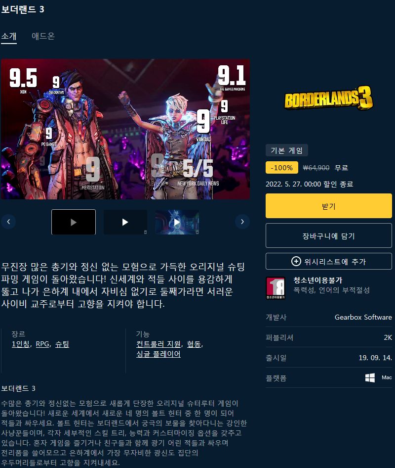 (에픽게임즈 무료게임) 보더랜드 3(Borderlands 3) 본문