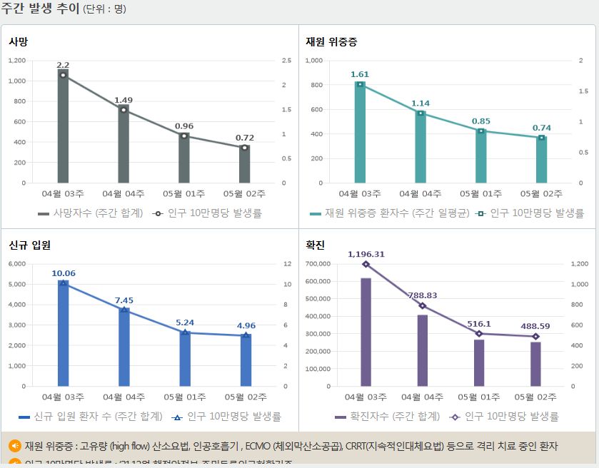 사망자는 완만하게 줄어가고 있는데, 신규확진자, 신규입원자, 재원위중증환자의 감소세는 이제 바닥에 온 느낌입니다. 사망자가 줄어든 것은 어쩌면 신규확진자가 줄어든 만큼 먹는 치료제와 주사제를 받거나 원격관리받는 환자 비율이 올라가설일지도 모른다는 생각이 드는데, 실제로는 어떨지 모르겠네요.