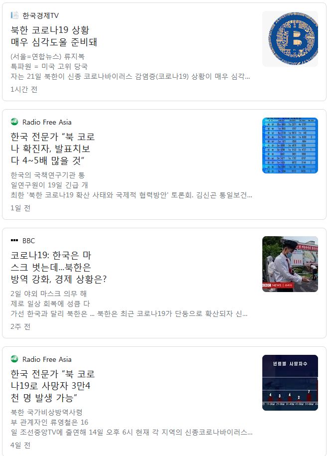 확산이 빠른데 외부의 도움은 필요없다네요. 참 무책임해보이는.. 너무 빠르니 '이미 버린 몸', (평양꼭대기 자기들은 맞았겠지만) 일반국민은 무접종으로 집단면역가자며 포기한 것인가. 하긴 북한의 열악한 보건 인프라를 생각하면, 예방접종을 다 마추기 전에 전인구가 걸릴지도 모르겠다는 생각이 안 드는 것도 아니지만 참 그렇네요.