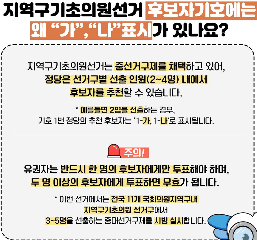 지역구 기초의원선거는 중선구제라 정당별로 2명 이상을 후보로 낼 수 있지만,