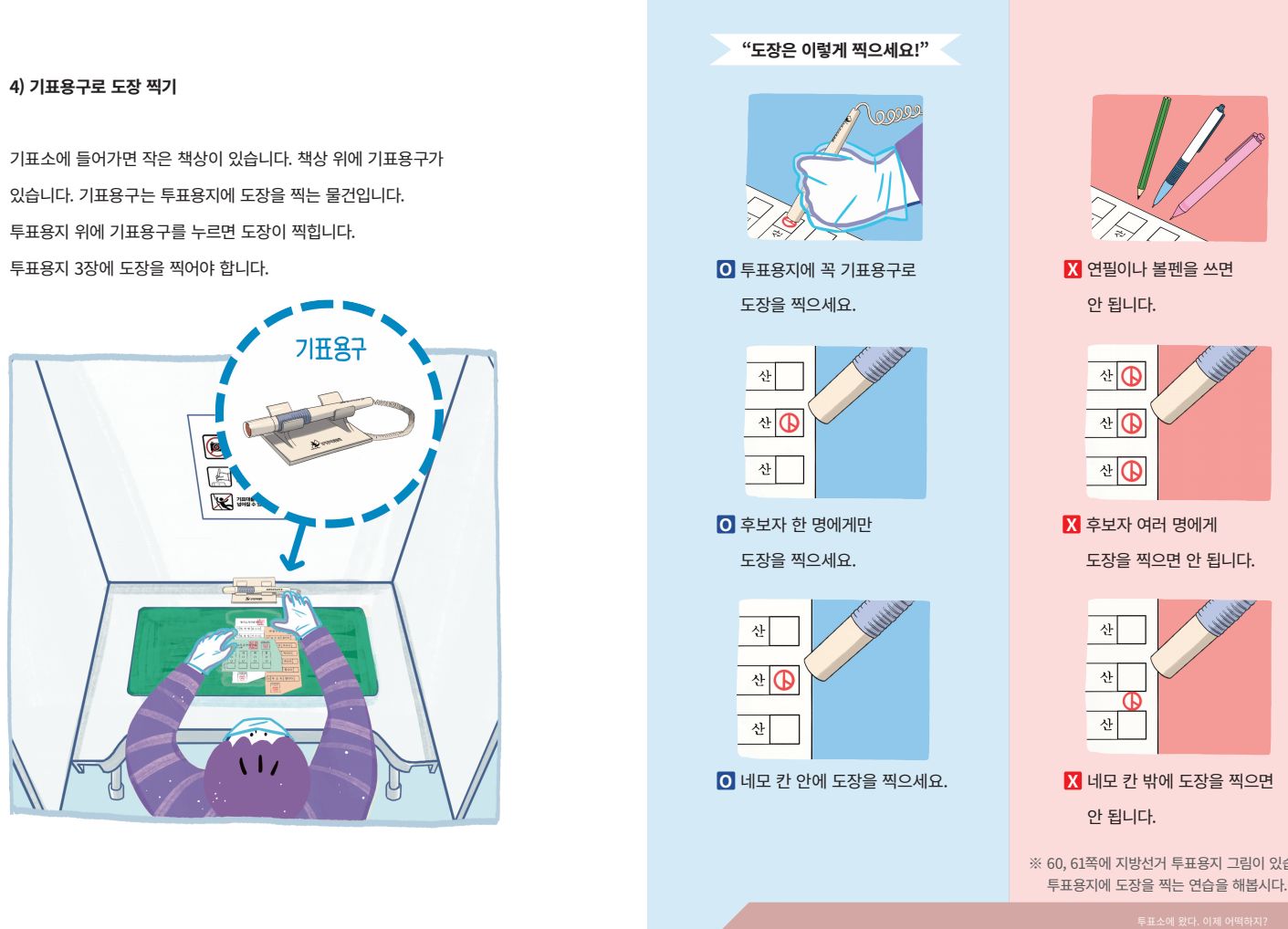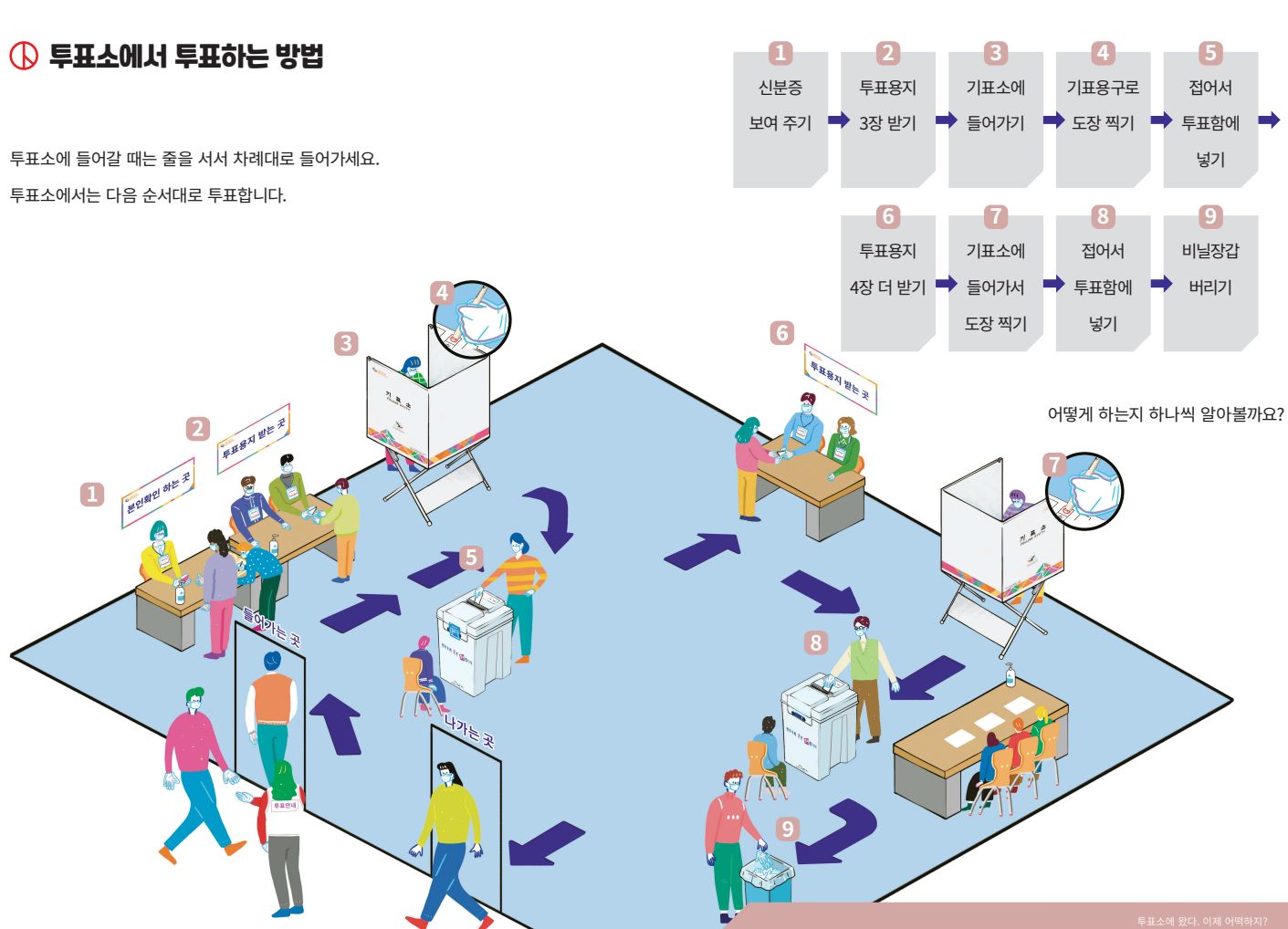 전체적으로 필요한 내용이 대부분 들어가기는 했는데, 옛날과 달리 요즘은 순서도형식으로 그림을 그려주는 홍보물이 선관위 홈에 바로 안 보이네요. 투표소 입구에 들어가서 뭐하고 다음 어디가서 뭐하고 다음 어디서 기표하고 투표용지를 안 보이게 접거나 봉투에 넣어봉함한 다음에 어떻게 넣어라 등등 그림으로 동선을 그려준 게 참 보기 좋았는데요.. 해서 찾아봤는데, => 멀쩡하게 잘 만들어놨네요. 좀 링크를 홈에 빼주지.. 아래 그림입니다. 책자 링크도 했습니다.