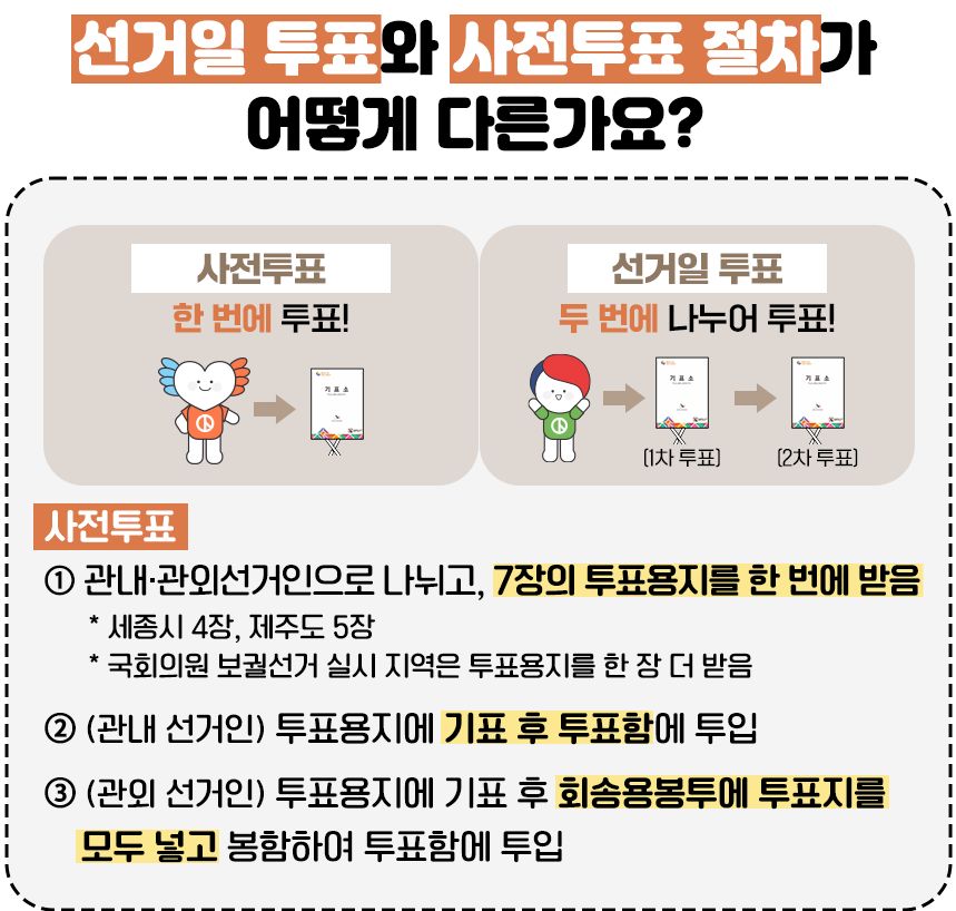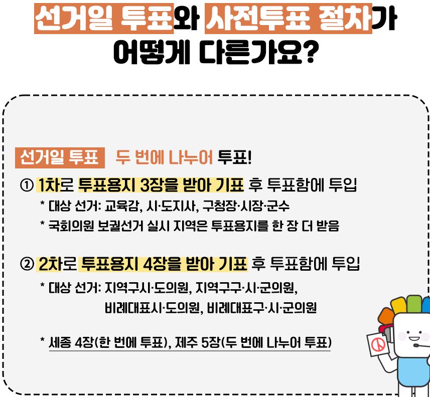 ㅡ 선거일투표는 투표소에 가면 투표를 두 번에 나눠서 한다고. 과거 기사를 참고하면 이번에도 1차투표는 광역자치단체장, 교육감, 기초자치단체장을 뽑는 투표용지 .. 모두 3장, 2차투표는 광역의원과 기초의원 지역구, 비례 투표용지 .. 모두 4장일 것 같은데, 저는 사전투표위주로 해서 저건 생각이 안 나네요. ^^