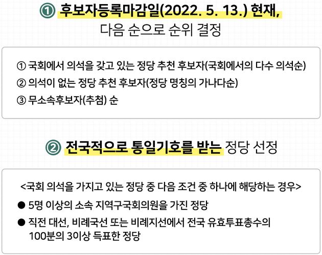 "이번 지방선거에서는 국회 의석수가 가장 많은 더불어민주당이 기호 1번, 국민의힘은 2번, 정의당은 3번을 받게 된다" - 연합뉴스, 2022.5.12