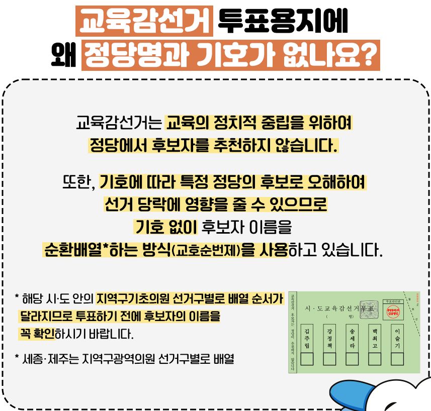 교육감선거 투표용지에는 정당이름과 정당기호를 표시하지 않습니다.