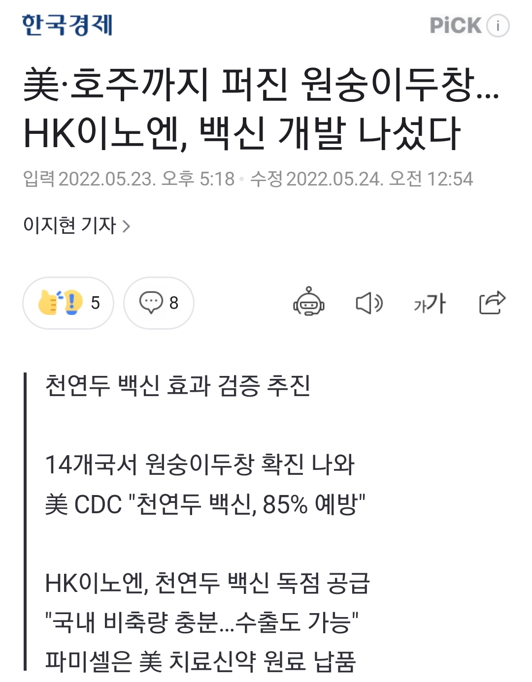 ㅡ 미국 질병통제예방센터(CDC)는 기존 천연두 백신으로도 원숭이두창을 85% 정도 예방할 수 있을 것으로 평가했고, 이에 따라 HK이노엔은 천연두백신의 적응증에 원숭이두창을 포함하기 위해 임상 시작. 유럽회사 1곳은 이미 그렇게 미국FDA승인받음.