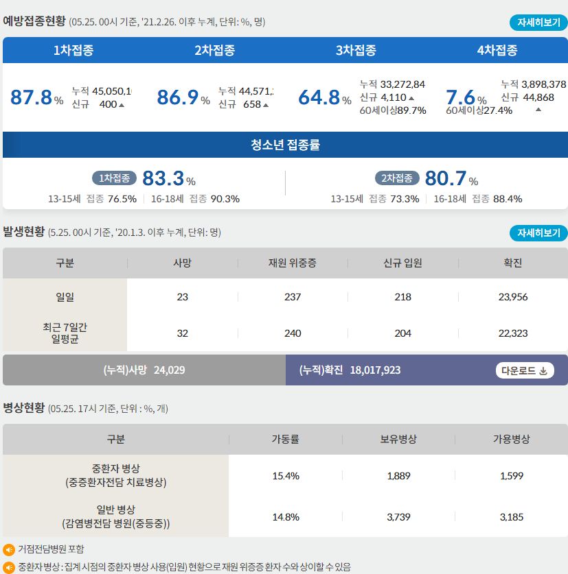 | 코로나19집계(2022.5.26. 0시기준): 확진 +1.9만, 사망 +34명, 위증증병상가동률 15%, 재택치료 13만(집중관리 9천) (0) | 2022.05.27 |