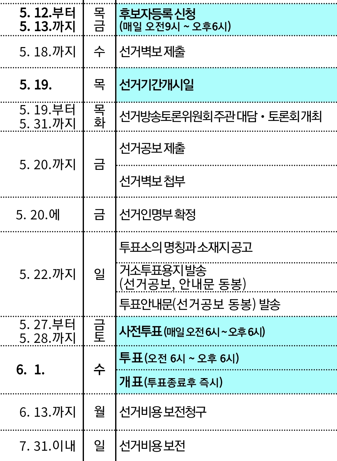 출처는 중앙선거관리위원회 사이트입니다. 사전투표일은 5월 27일 금요일, 5월 28일 토요일입니다. 선거일은 6월 1일이며, 그때는 선거인명부등록된 주민등록지 관할 투표소에서만 투표할 수 있