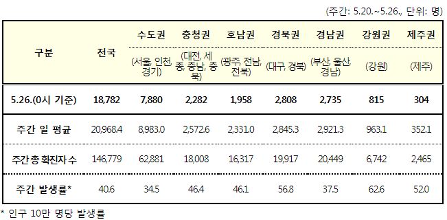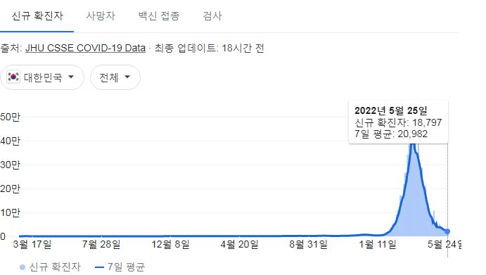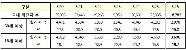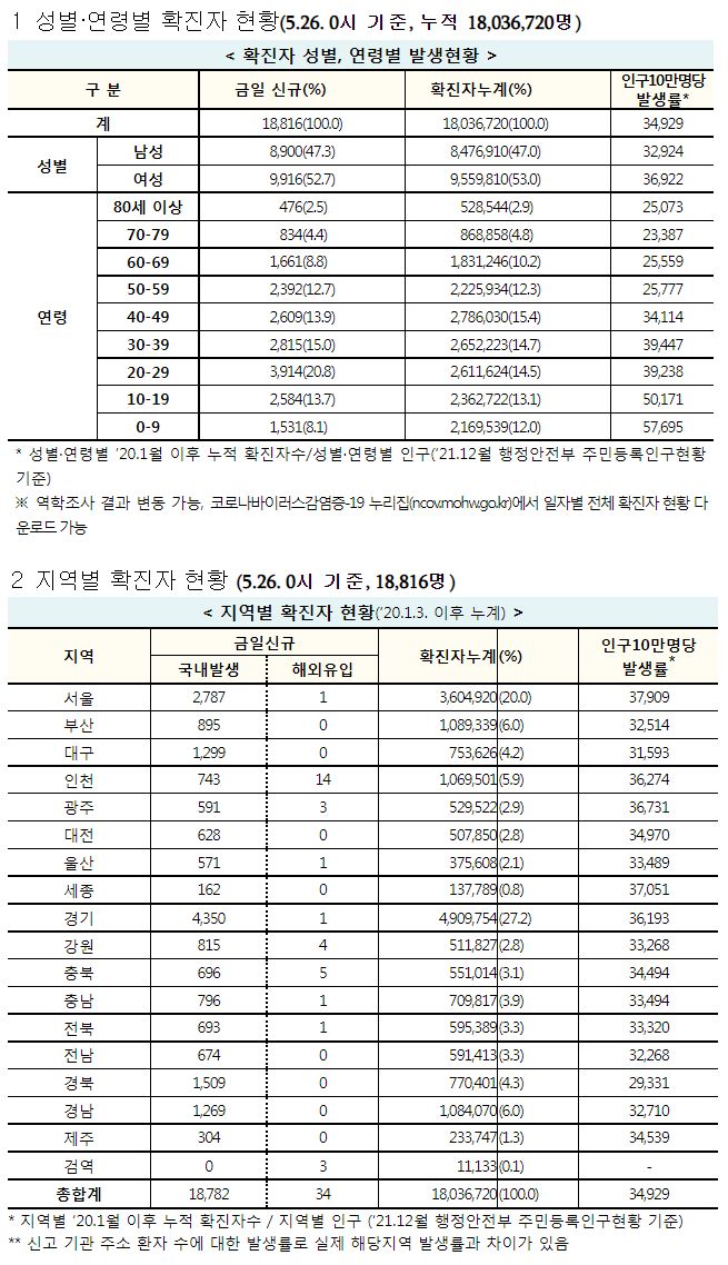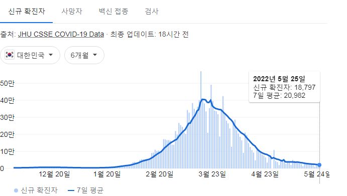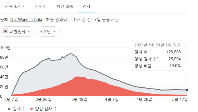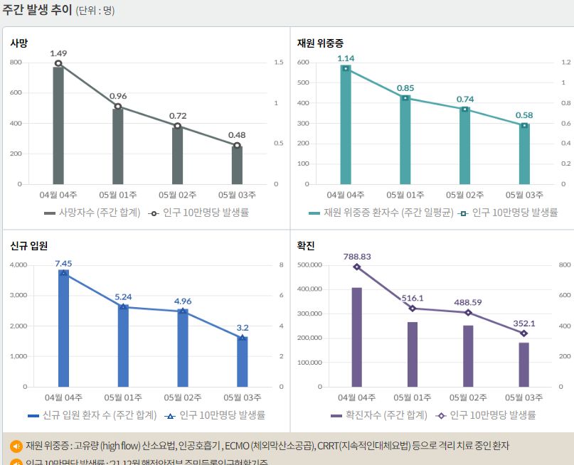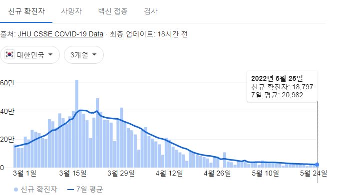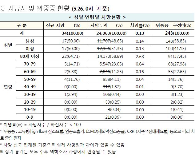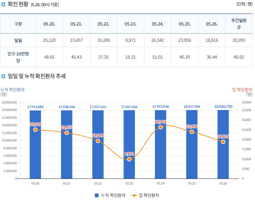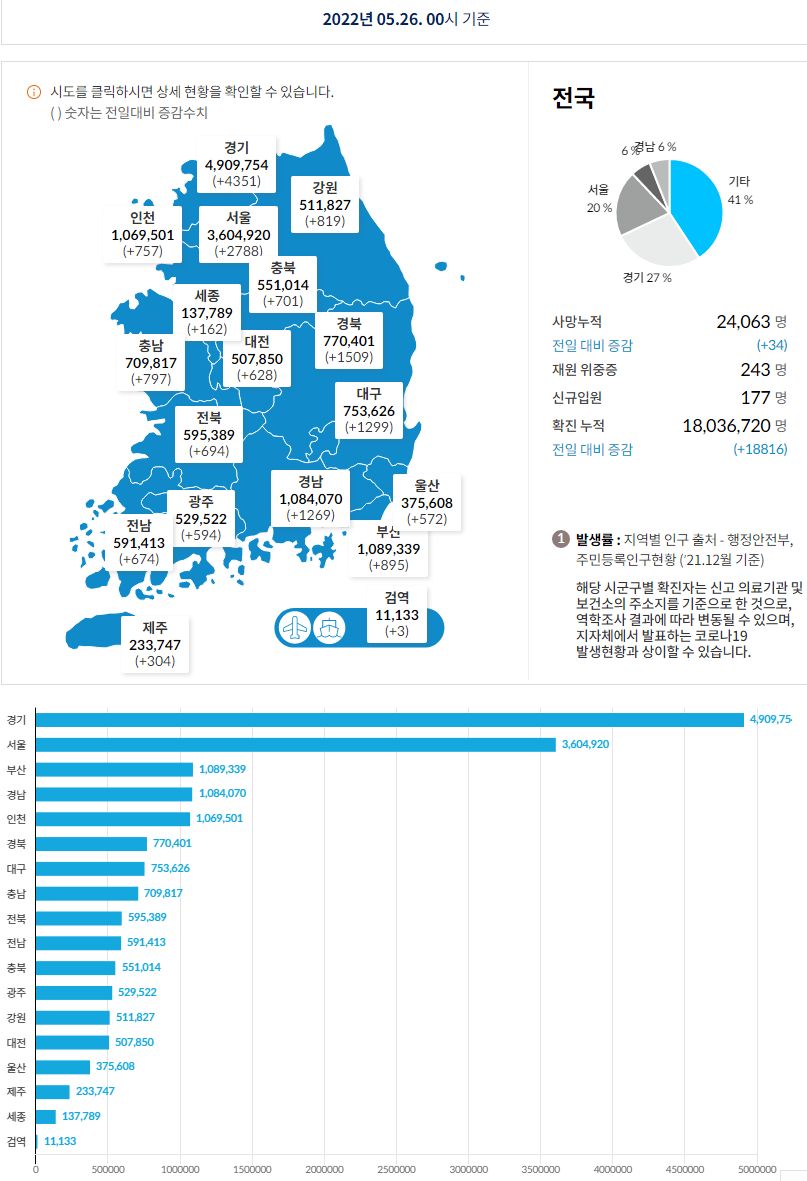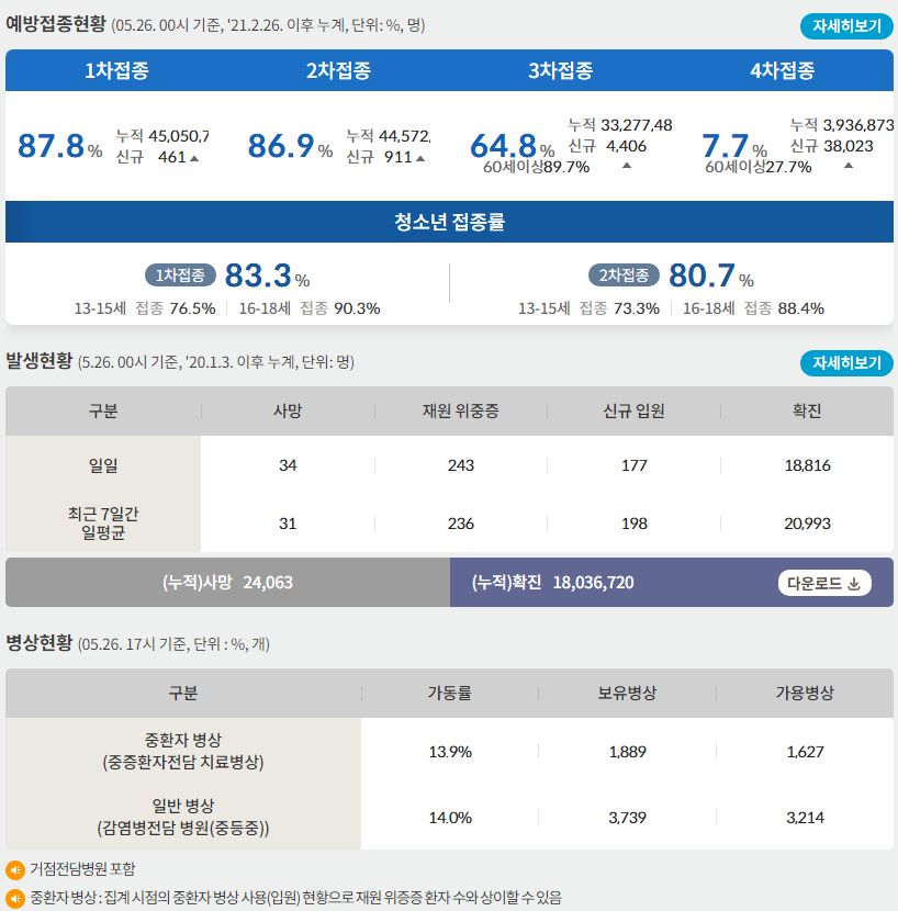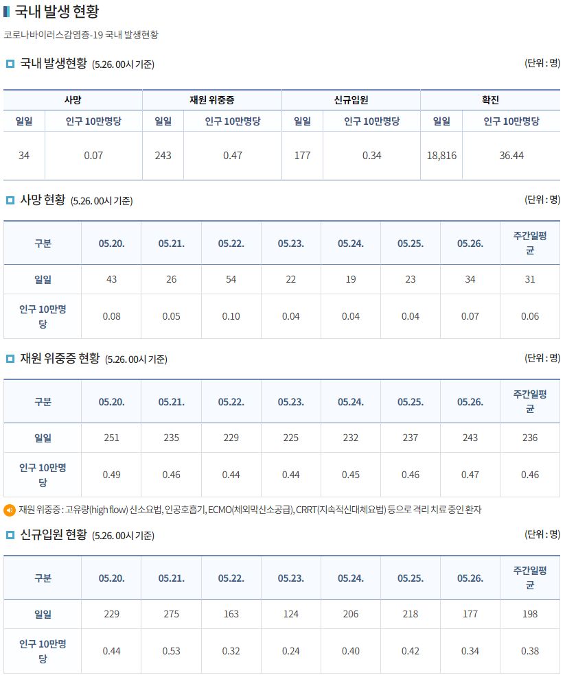 코로나19집계(2022.5.26. 0시기준): 확진 +1.9만, 사망 +34명, 위증증병상가동률 15%, 재택치료 13만(집중관리 9천) 본문