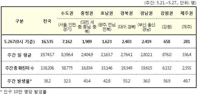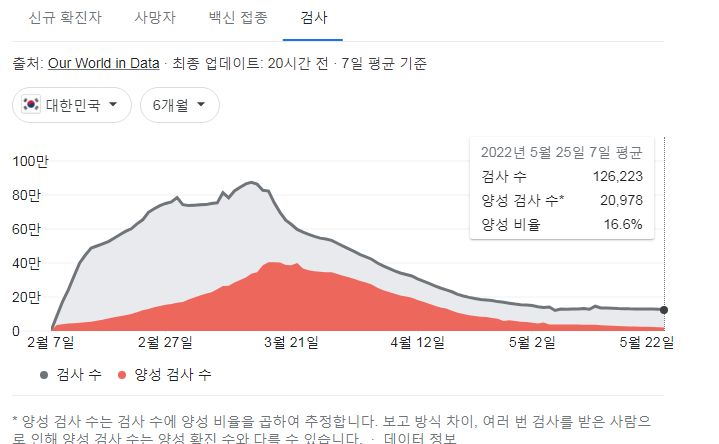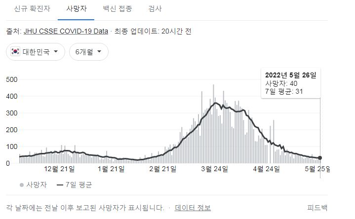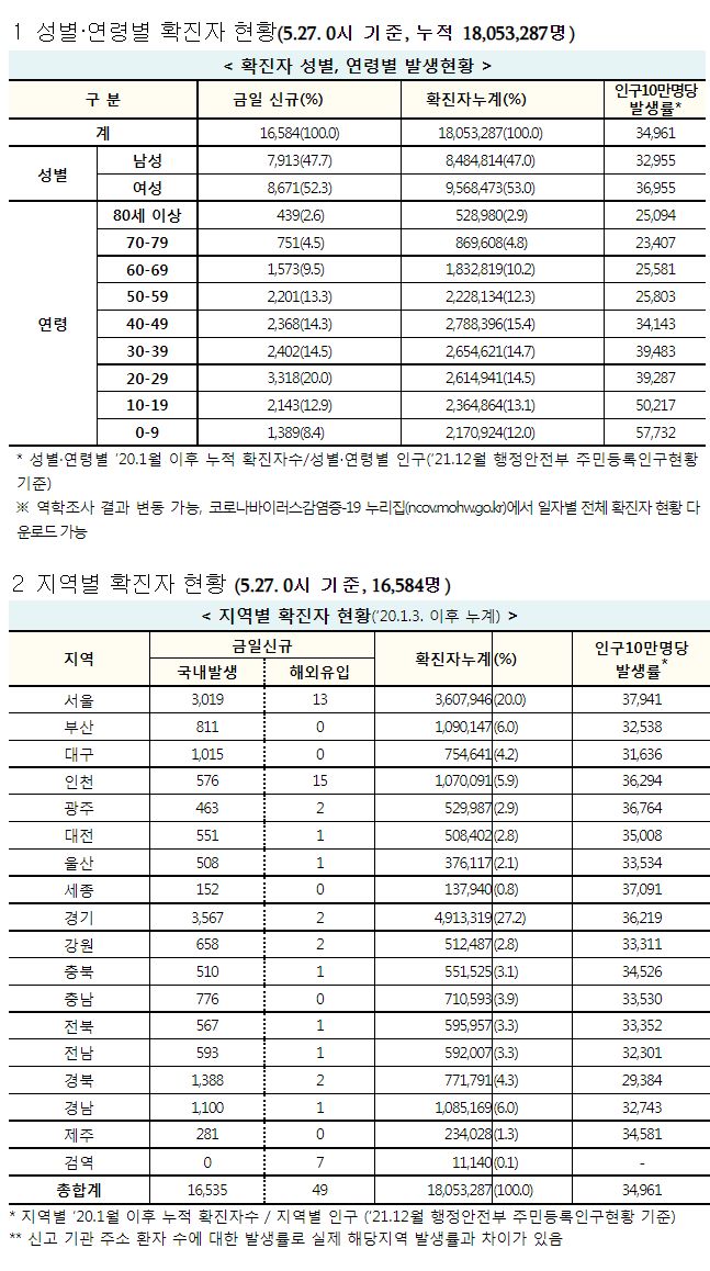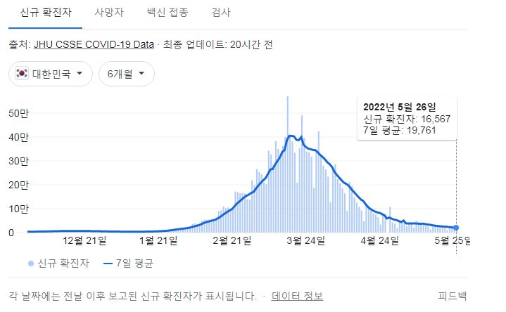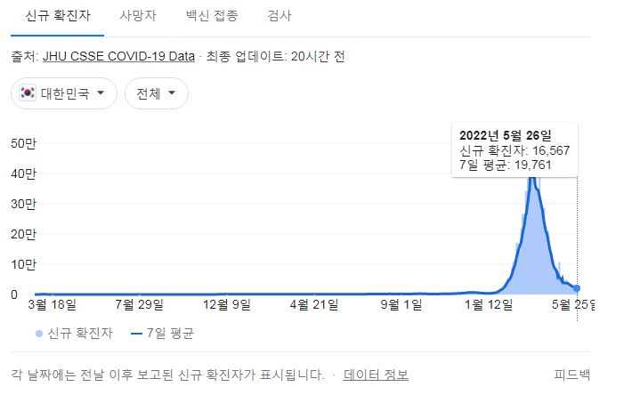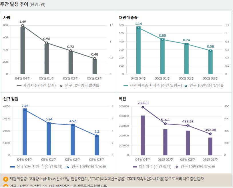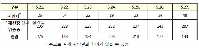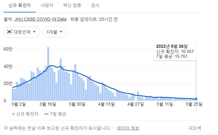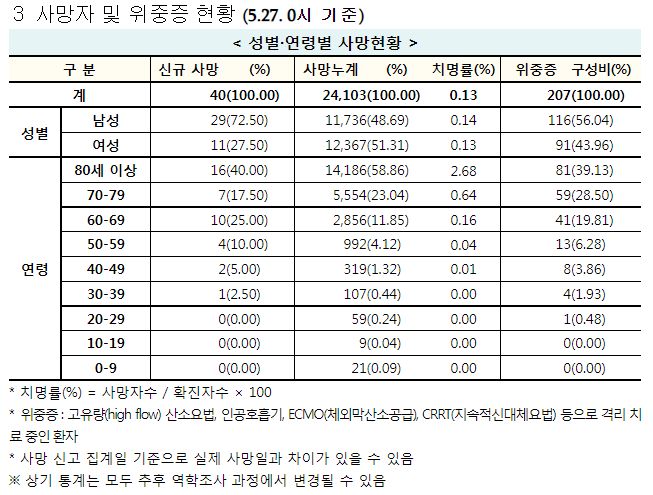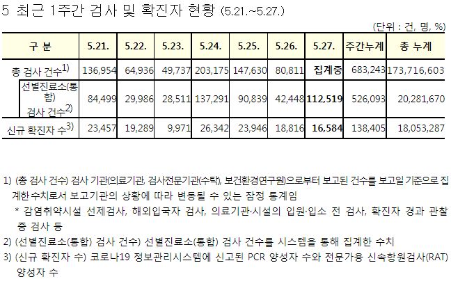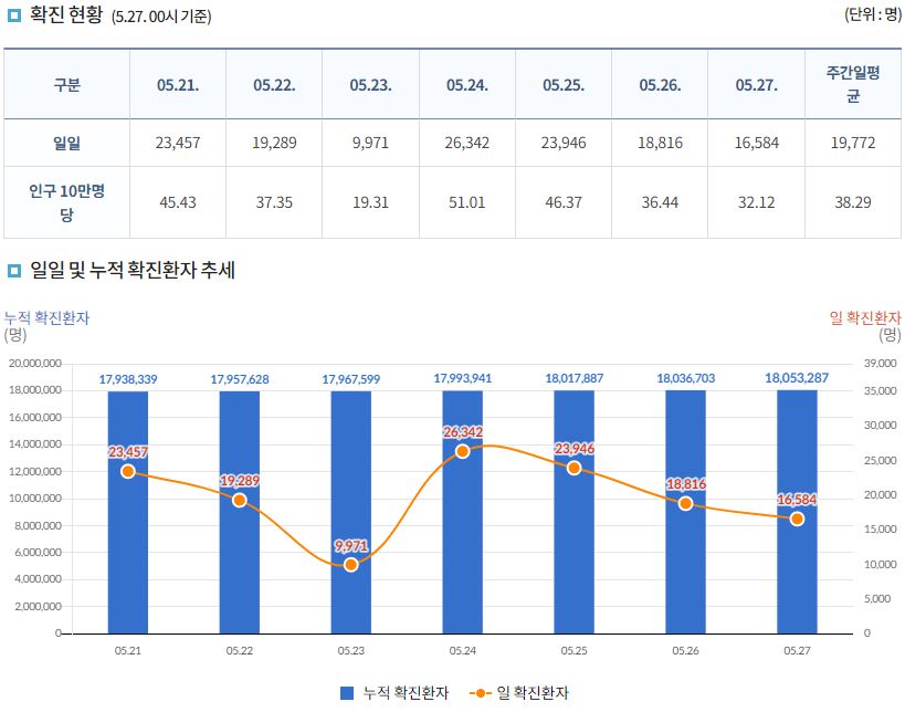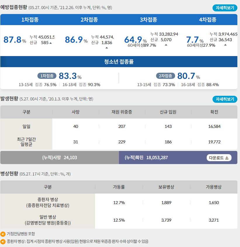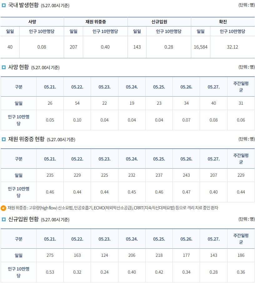 코로나19집계(2022.5.27. 0시기준):확진 +1.7만, 사망 +40명, 위중증병상가동률 14%, 재택치료 13만(집중관리 8천) 본문