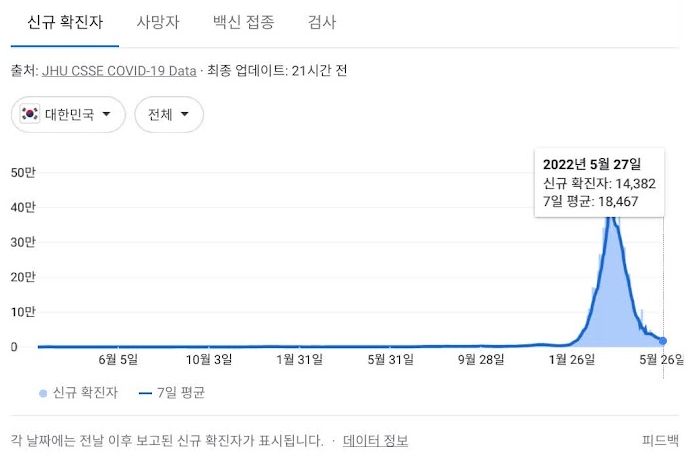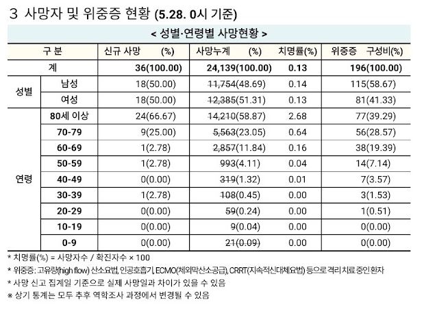 코로나19집계(2022.5.28. 0시기준): 확진 +1.4만, 사망 +36명, 위중증병상가동률 13%, 재택치료 12만(집중관리 7천) 본문