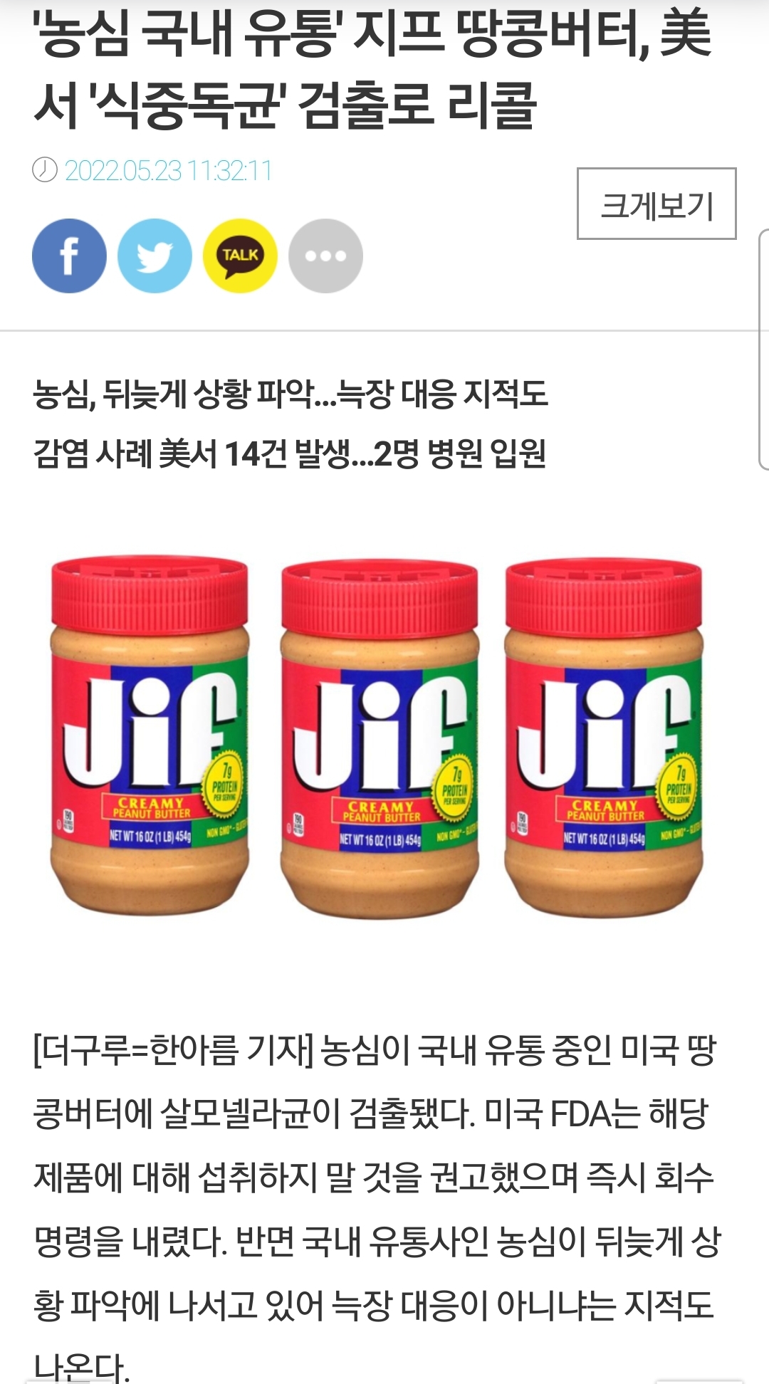 '농심 국내 유통' 지프 땅콩버터, 美서 '식중독균' 검출로 리콜