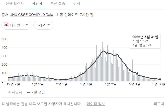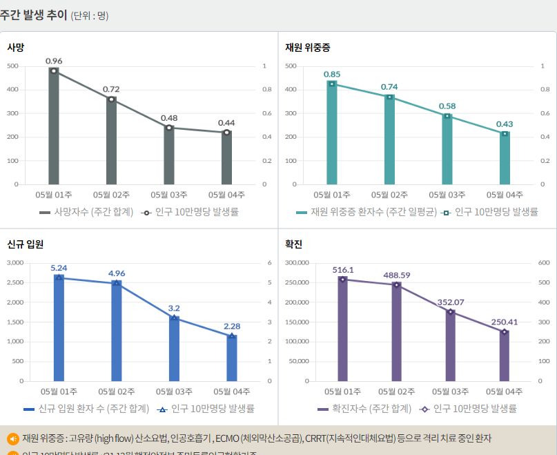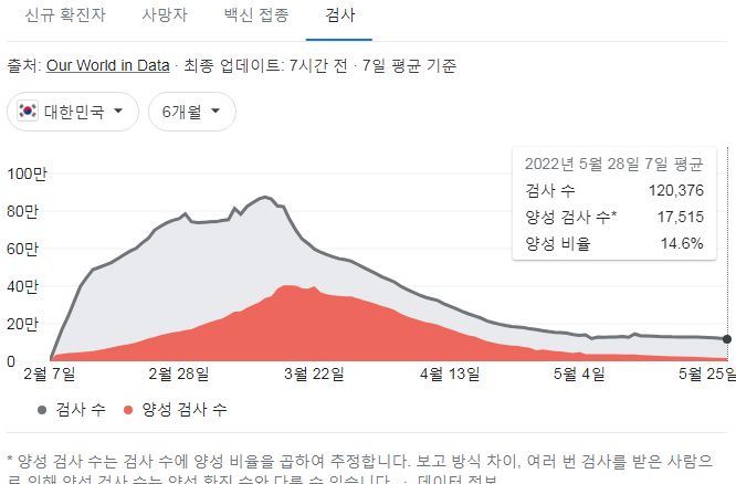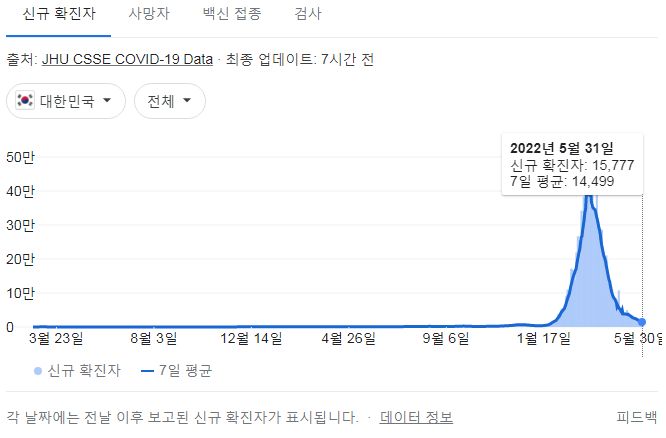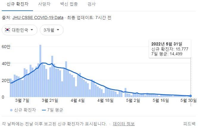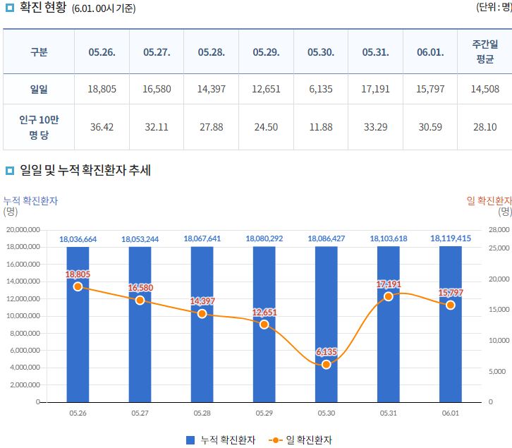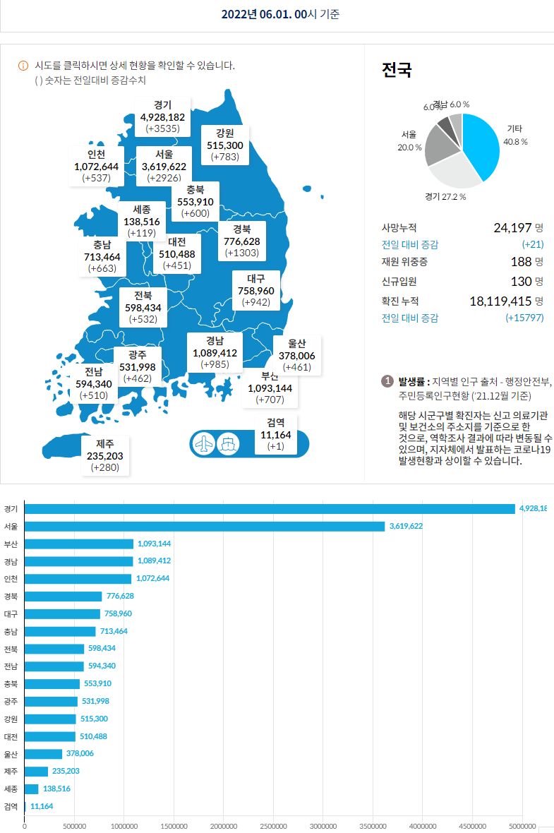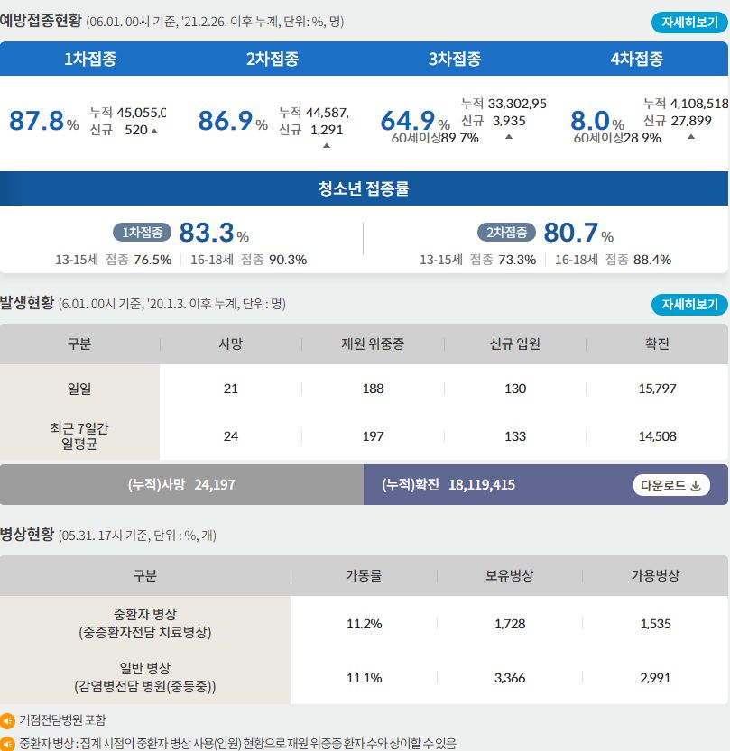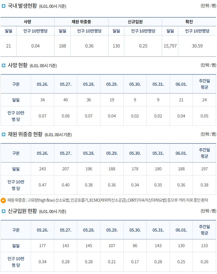 코로나19집계(2022.6.1): 확진 +1.6만, 사망 +21명, 위중증병상가동률 11%, 재택치료 ?만(집중관리 ?천) 본문