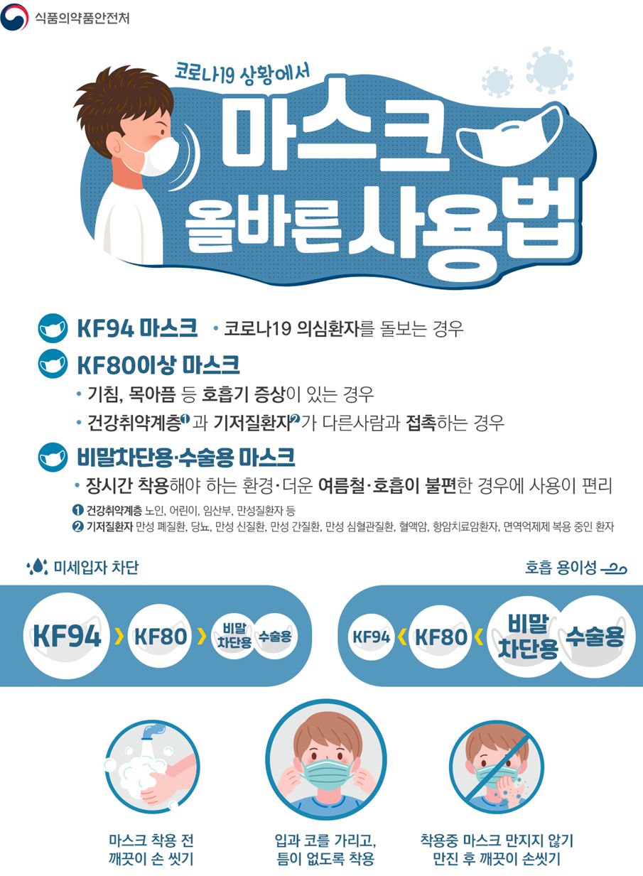 하지만 노인이나 어린이, 임신부, 호흡기나 심혈관질환자 등 고위험군에게는 오히려 보건용 마스크가 독이 될 수 있다. 호흡이 불편해질 수 있기 때문이다. 이를 위해 식약처는 지난 6월 덴탈마스크처럼 얇아 호흡이 편하지만, 바이러스 입자를 55~80% 차단할 수 있는 비말 차단용 마스크(KF-AD)를 허가했다. 역시 방수 기능이 있어 본인과 다른 사람의 침방울을 막을 수 있다.
