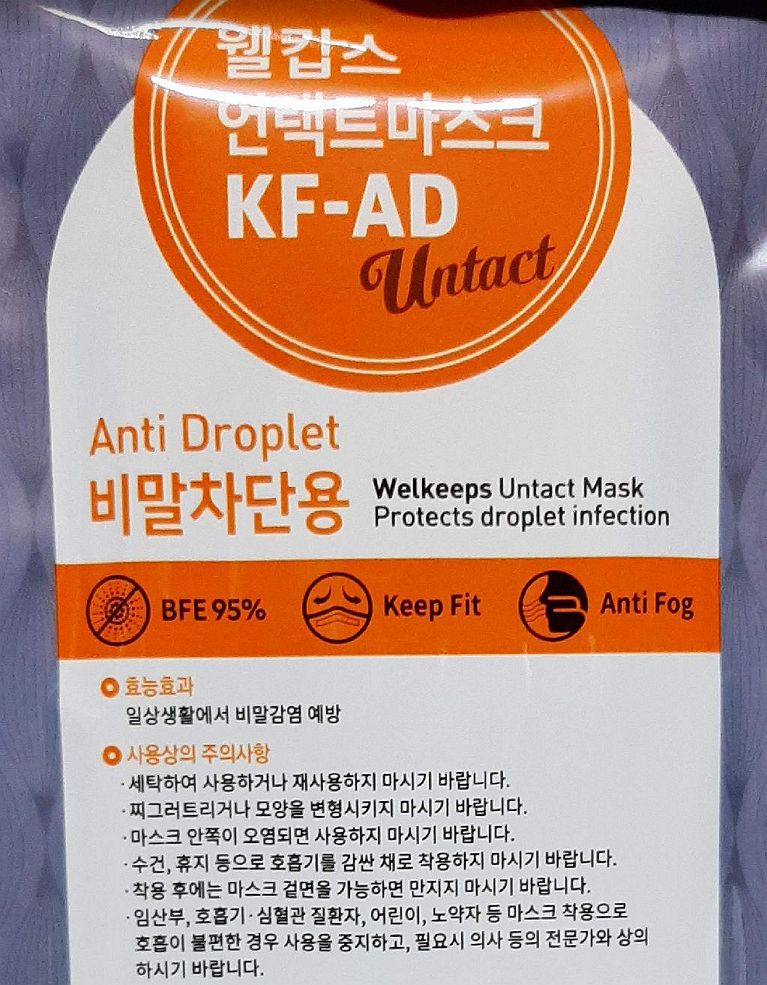 KF-94보다는 약한 KF-AD입니다. 보통 형상이고 새부리나 덴탈마스크형상은 아닙니다. 대신, KF94는 3겹이나 4겹이지만, 이건 2겹이네요1. 얇은 만큼 하기 편하고, 자재도 덜 쓰지만 호흡하기 편하라고 나온 규격입니다.