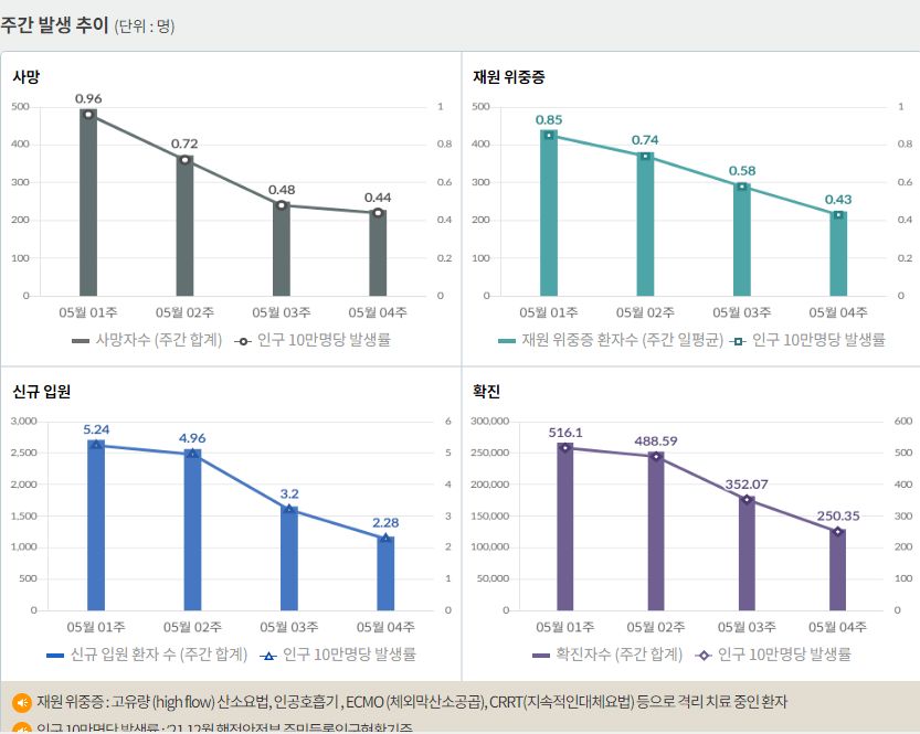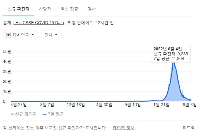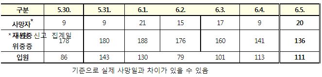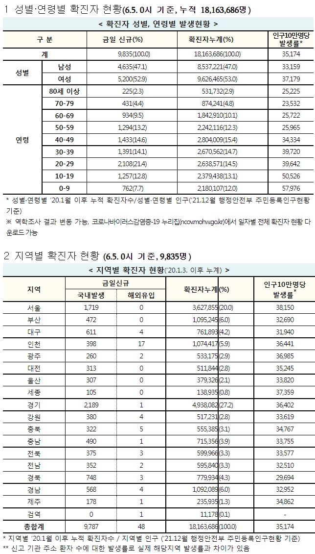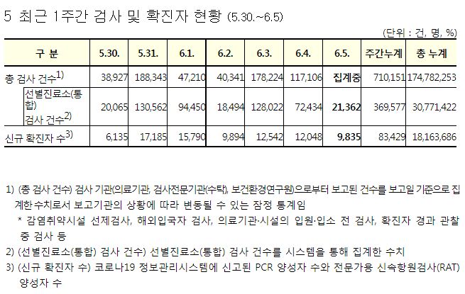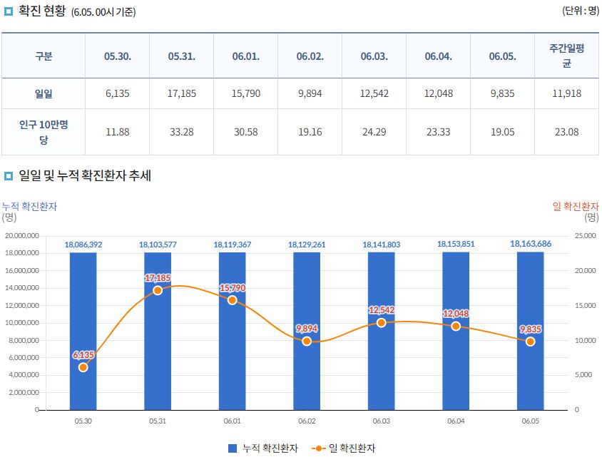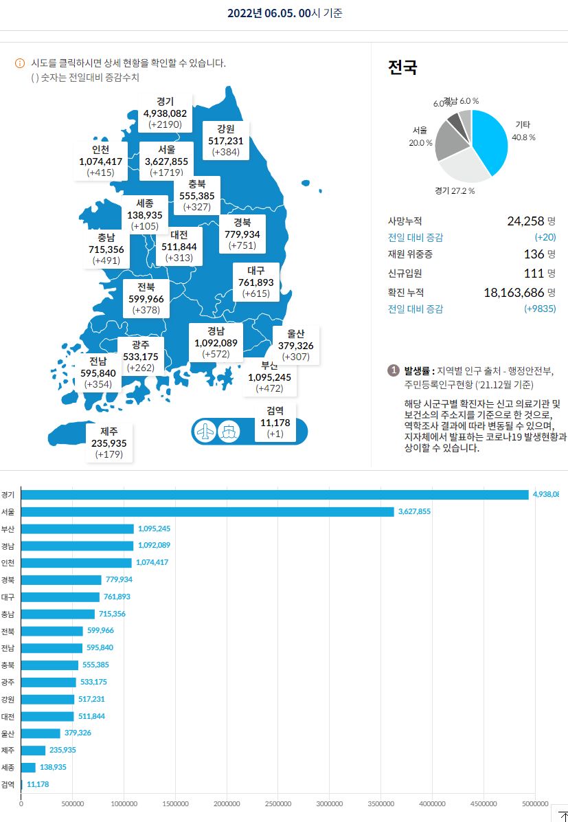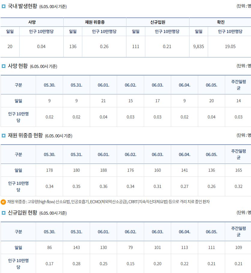 코로나19집계(2022.6.5. 0시기준): 확진 +9835명, 사망 +20명, 위중증병상가동률 9%, 재택치료 8.4만(집중관리 4.5천) 본문