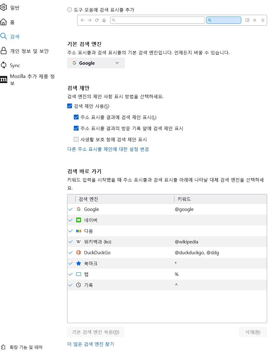 모질라 파이어폭스 주소창 검색 설정 본문
