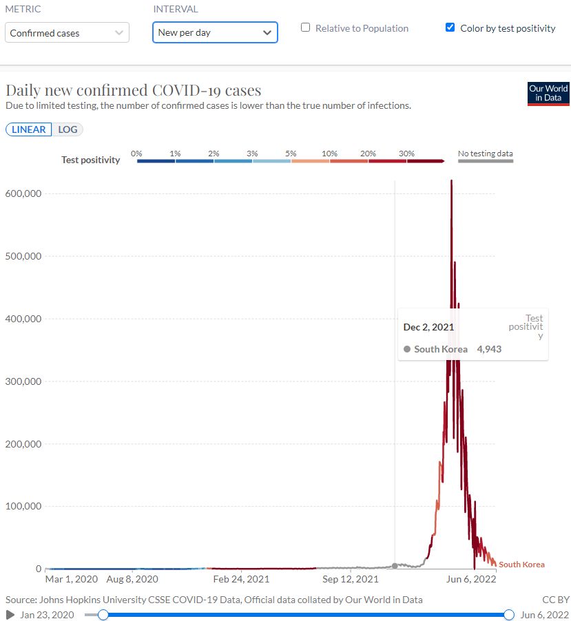 팬데믹의 끝에 와서 엔데믹을 앞당기기 위해, 정부가 거리두기 풀기를 강행해 희생을 감수한 결과, 아래 그래프를 얻었습니다. 오늘 확진자도 대단히 적더군요.