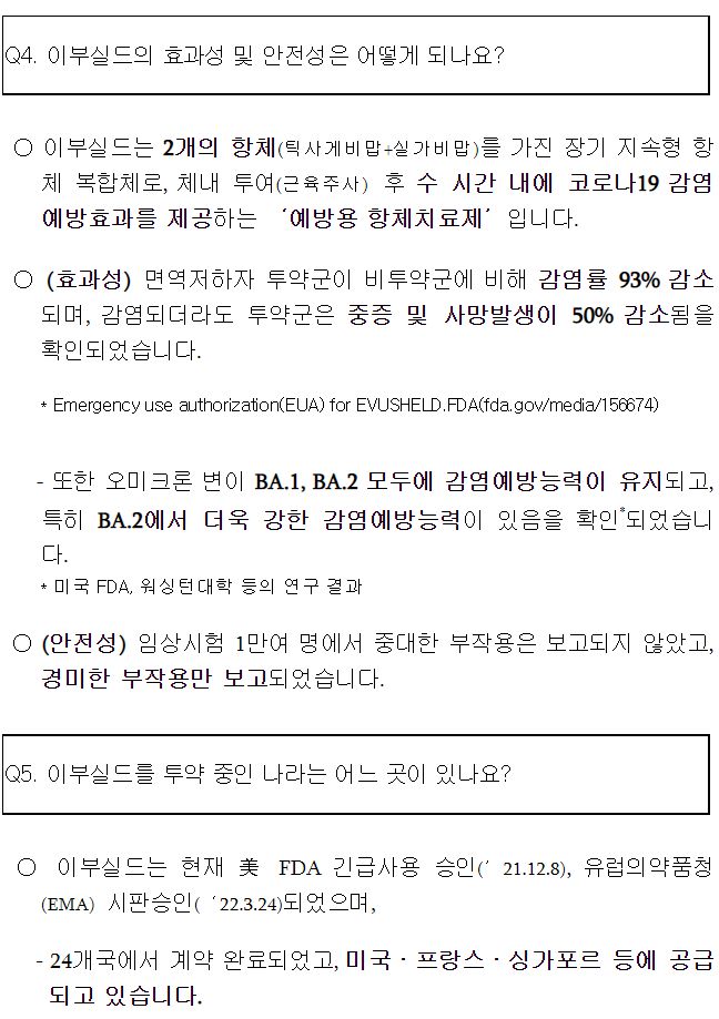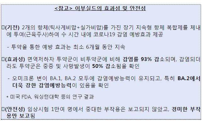 ㅡ 미국 FDA의 연구 결과, 이부실드 투약 시 감염은 93%, 중증 및 사망은 50%가 감소하는 등 예방 효과와 안전성이 확인됨에 따라, 미국은 지난 해 12월 긴급사용을 승인하였고 유럽은 금년 3월 시판 승인을 권고하였으며 현재 미국, 프랑스, 싱가포르 등에서 사용 중.