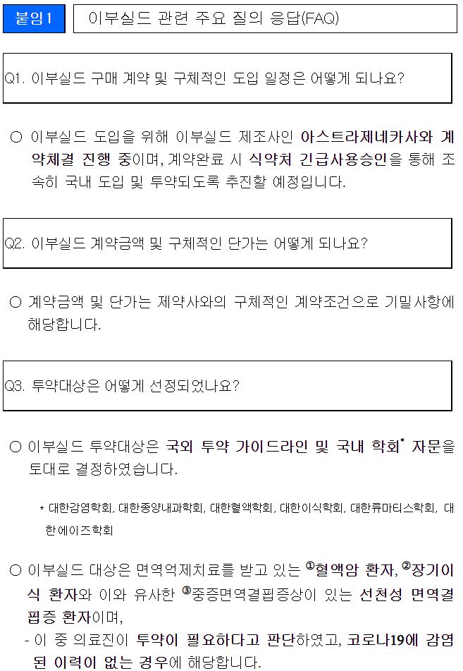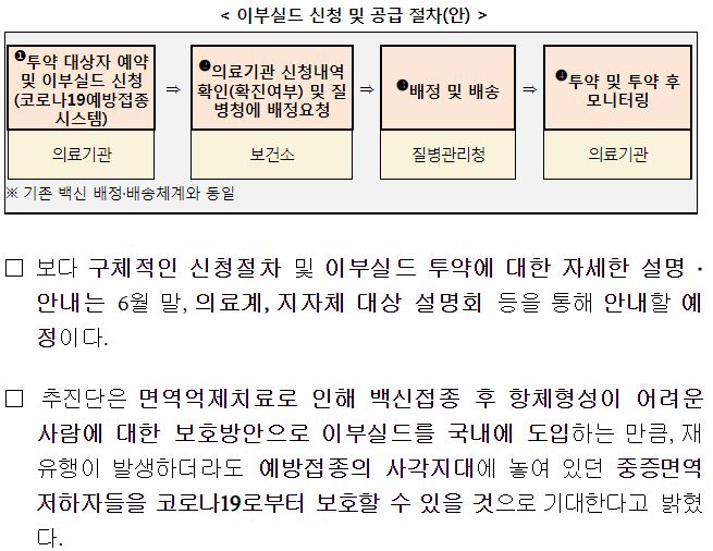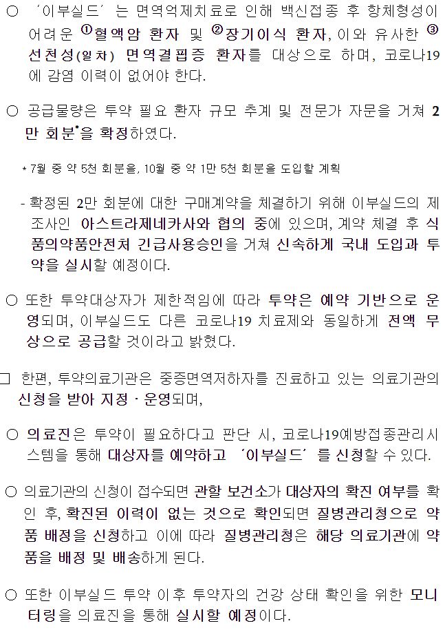 일단 2만 회 분 도입 예정인, 이부실드 처방 대상은 면역억제치료를 받고 있는 혈액암/장기이식환자, 중증면역결핍현상이 있는 선천성 면역결핍증 환자 중에서 선정.