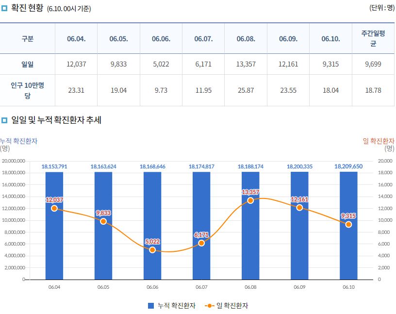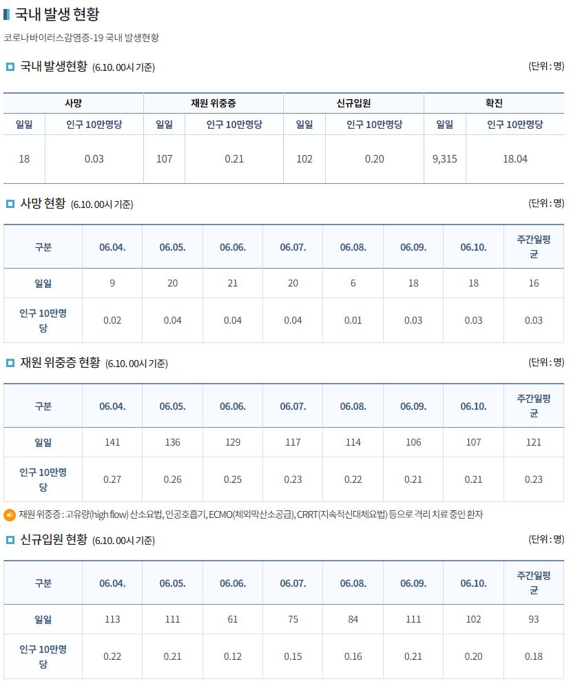 코로나19(2022.6.9. 0시기준): 확진 +9315명, 사망 +18명, 위중증병상가동률 9%, 재택치료 6.9만(집중관리 3.6천) 본문