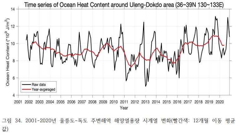 정선해양관측지점 자료를 이용하여 나타낸 국내 해역별 해양열용량 연평균 그래프이다. 전 해역에서 해양열용량의 상승 경향을 확인 할 수 있으며, 동해는 3.03x106Jm-2/year 남해는 0.02x106Jm-2/year,