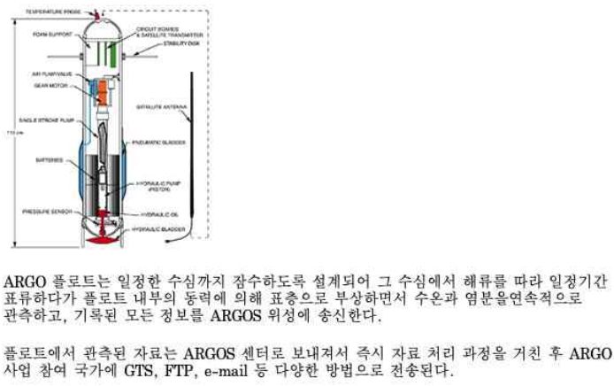 아르고 플로트. 전세계 바다에 뿌리는 수온과 염분 측정 부표. 심해에 내려가있다가 정기적으로 부상하며 수온과 염도를 측정하고 해수면에 올라오면 인공위성에 데이터 전송(아마 GPS좌표도 보내겠죠) 후 다시 잠수. 수명이 다할 때까지 이러기를 반복.
