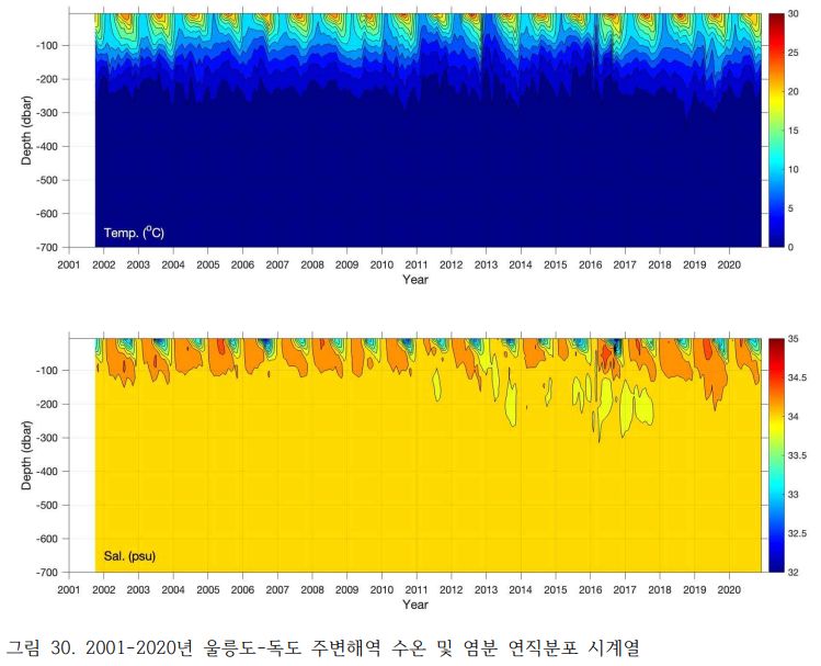 아, 이거 그리운 그림이네요.ㅎㅎ 어릴 적 교양 해양과학책에서 본 것을 꼭 닮은 그래프. 수심 삼백미터쯤부터는 수온은 0도보다 조금 높은 정도까지 내려가서 일정해지고, 염도는 평균적으로 표층보다 높고 100미터이내보다는 낮은, 무거운 물로 일정한 걸 보여주네요. 표층의 수온과 염도는 계절(위 그림. 매년 규칙적인 변화를 볼 수 있습니다)과 해류의 영향을 크게 받아서 편차가 크겠죠.