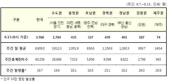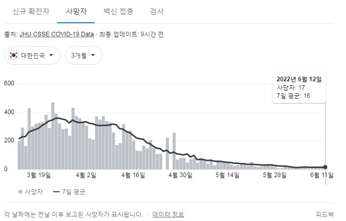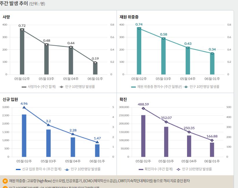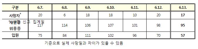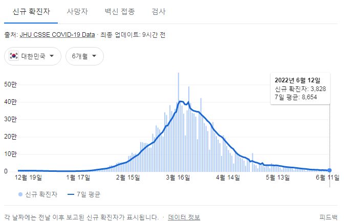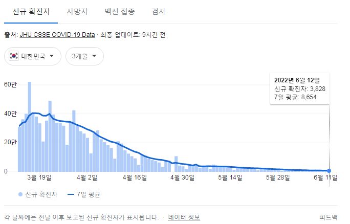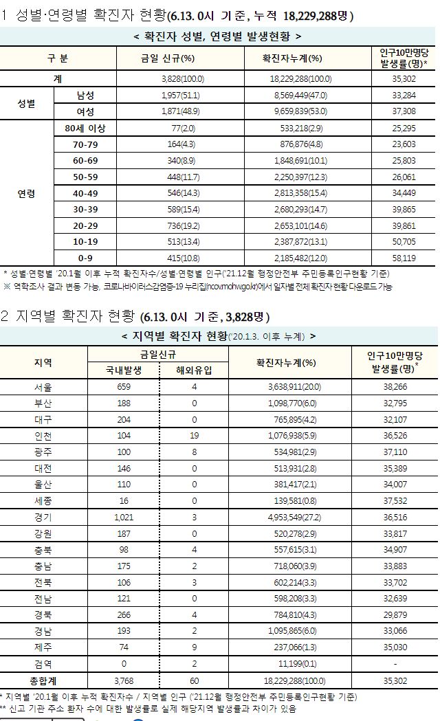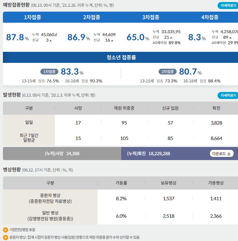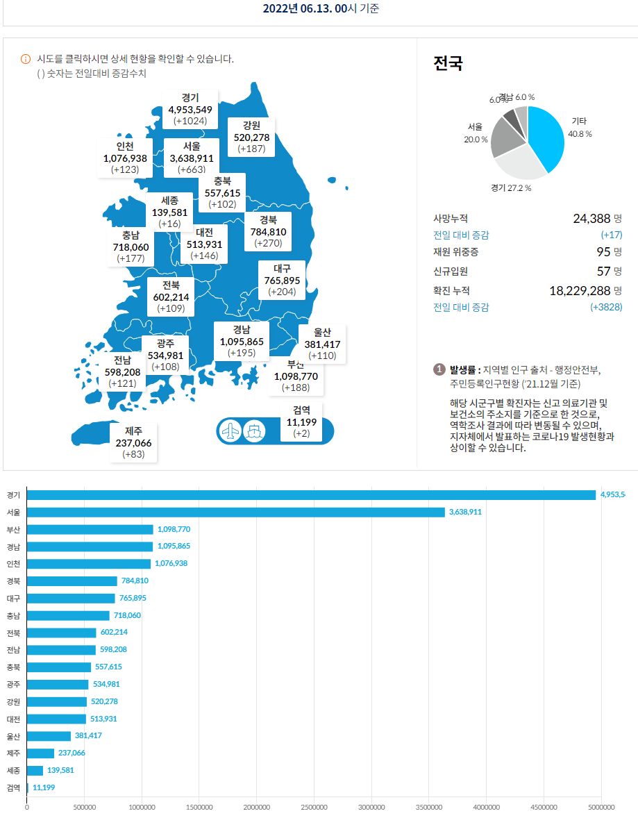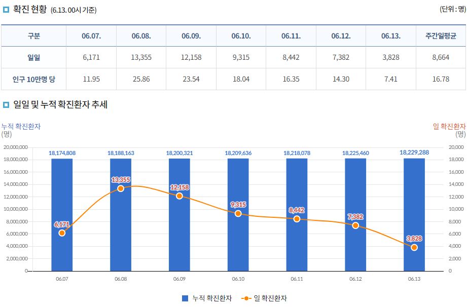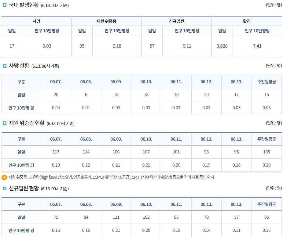 코로나19집계(2022.6.13. 0시기준): 확진 +3828★, 사망 +17, 재택치료 5.5만(집중관리 3.3천) 본문