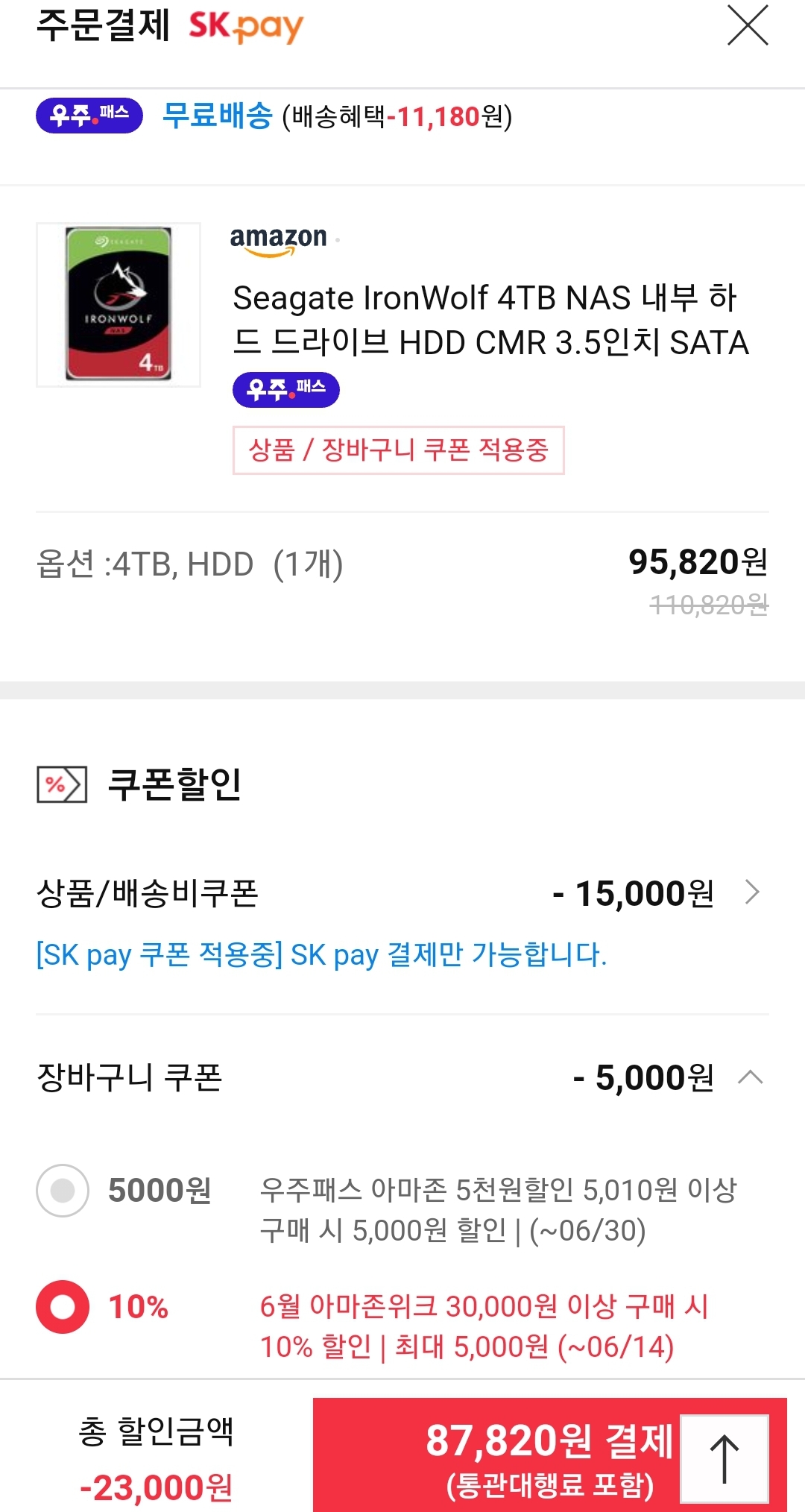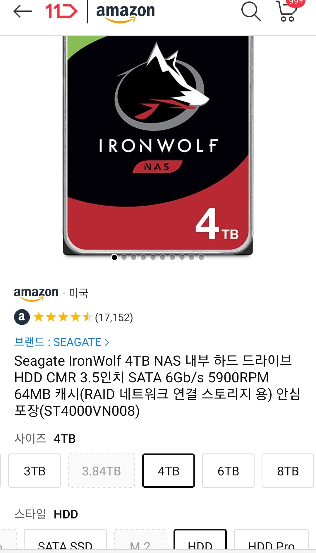 (11번가-아마존) 시게이트 아이언울프 4TB CMR HDD (~8.8만원) 본문